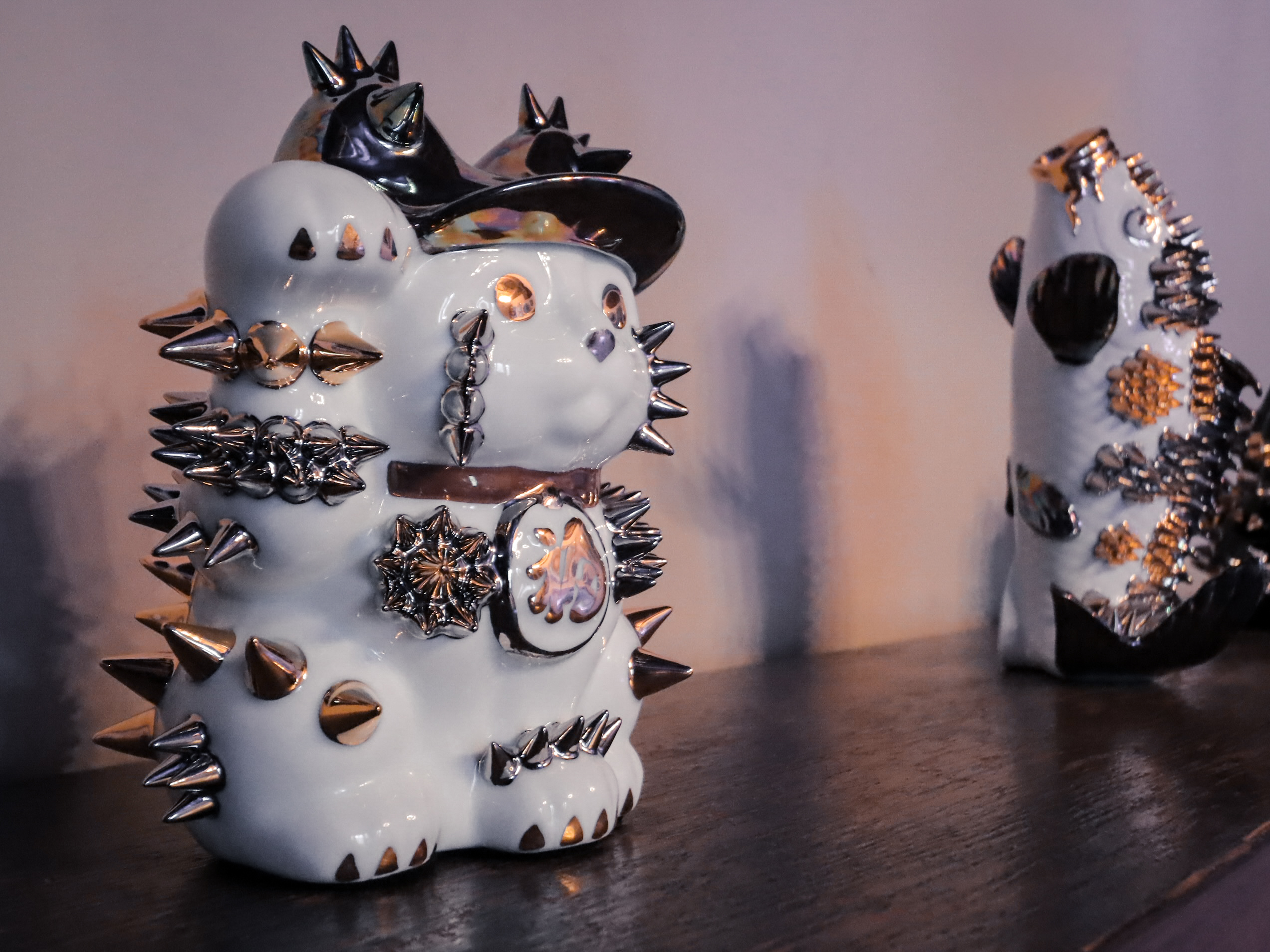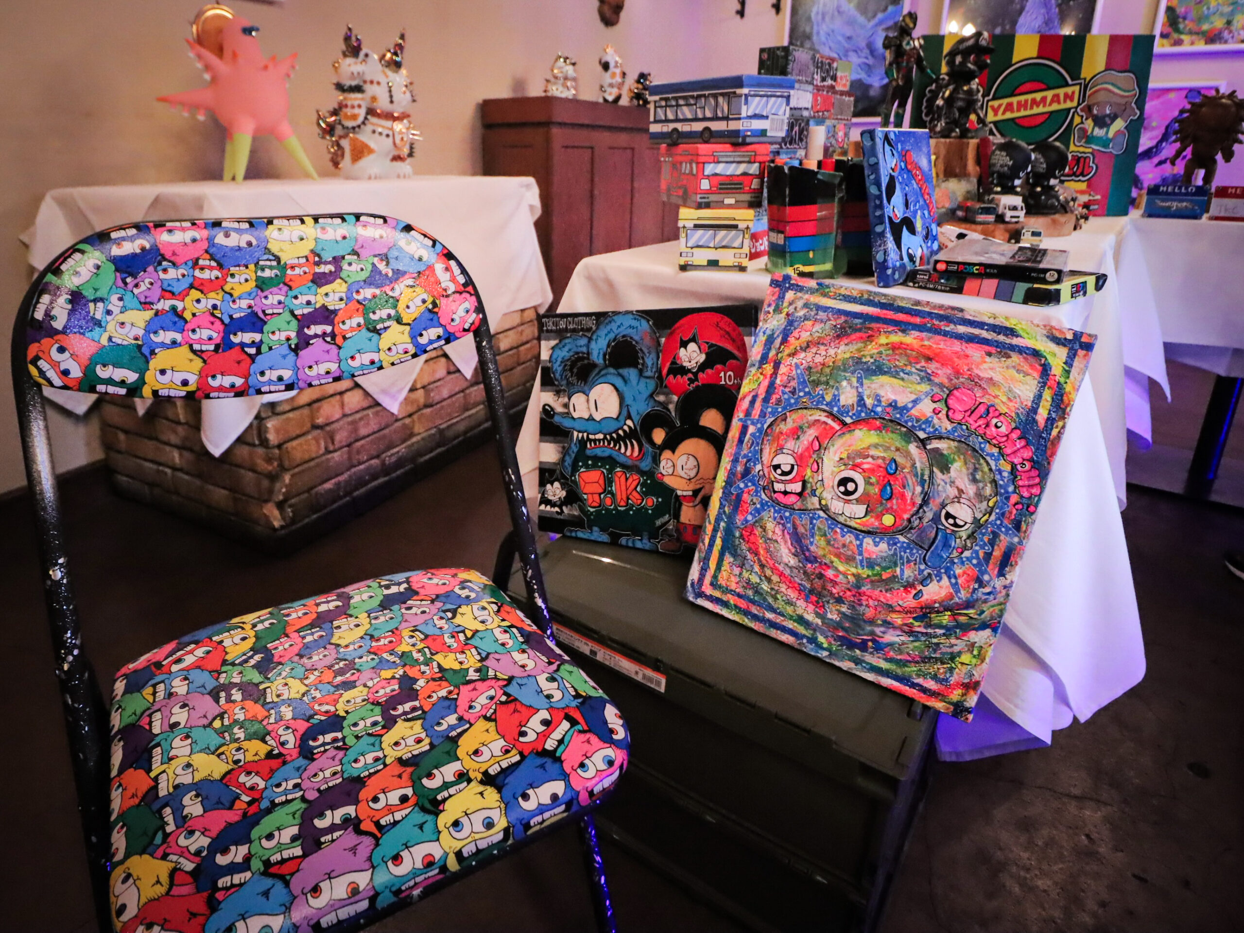 自分はブラックカルチャーが好きで、アフリカに行き、伝統工芸の木彫りなどを学びました。そこに、日本のポップアートをミックスしています。怪獣のソフビ人形も日本の伝統工芸で、その工場に依頼して作った作品もあります。