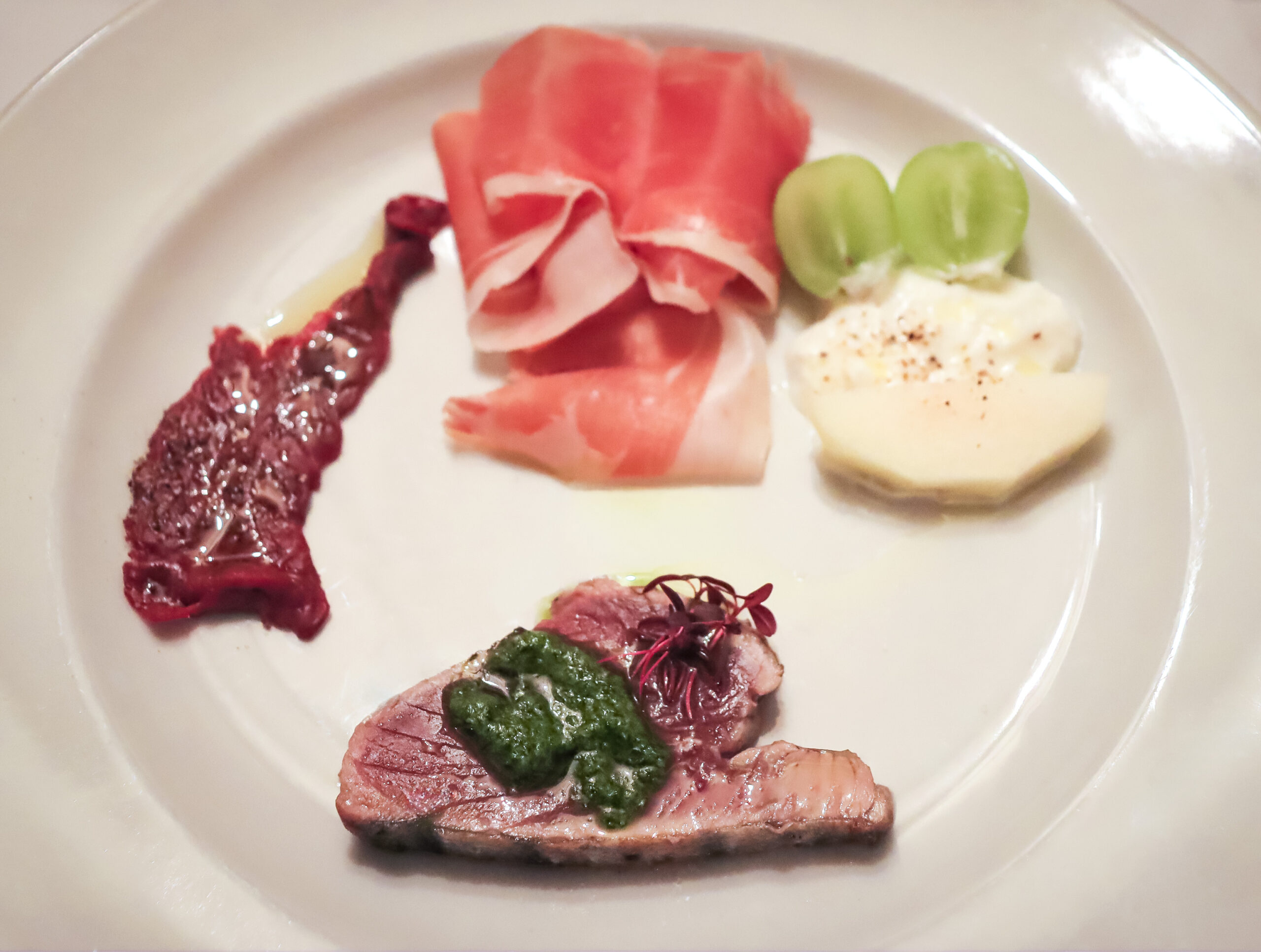 左から馬肉のカルパッチョ、カツオのカルパッチョ、生ハム、ブラータチーズと季節のフルーツ