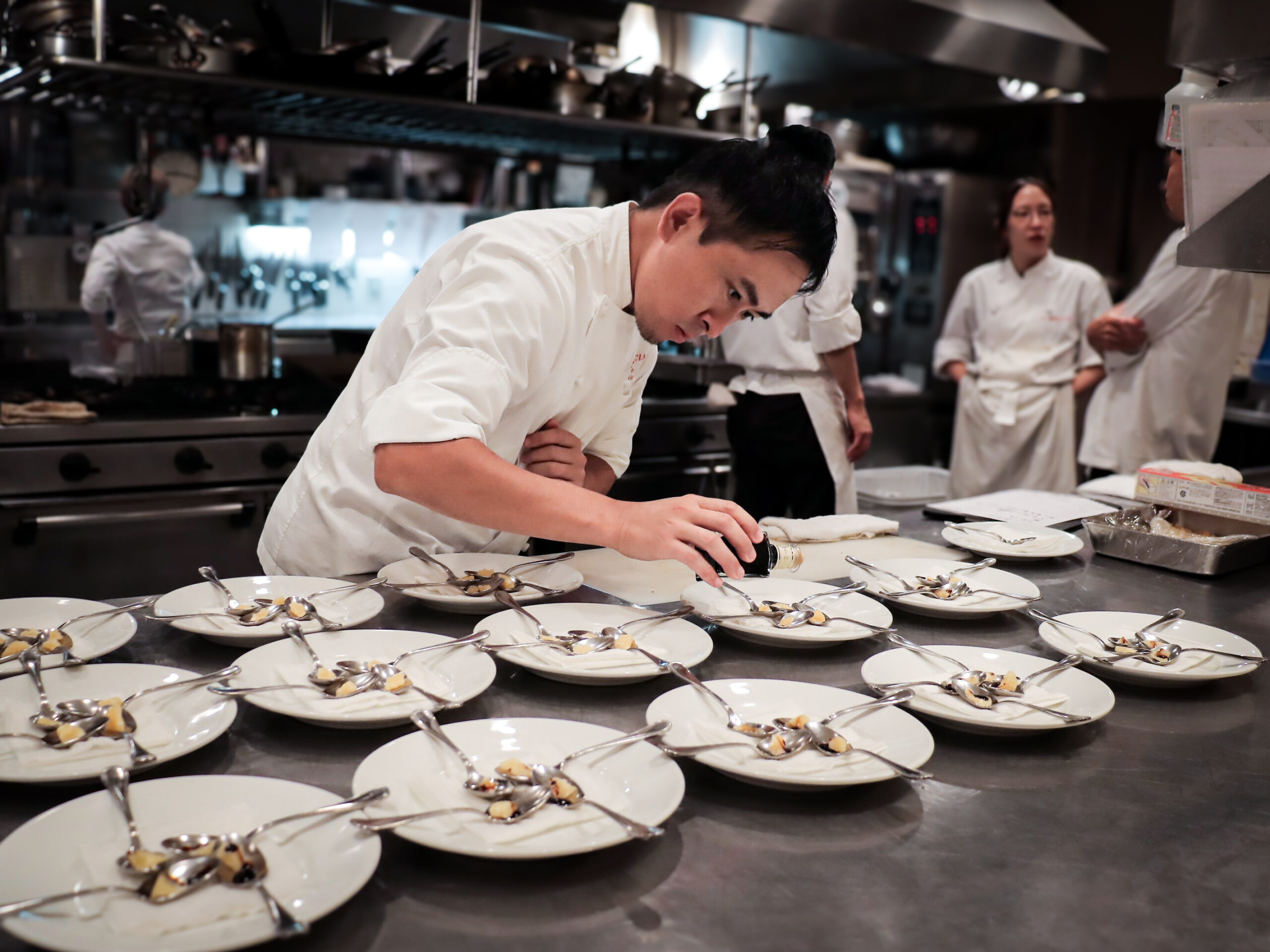 厨房でスプーンの上にパルミジャーノ・レッジャーノと100年熟成バルサミコ酢を盛り付けるラ・ビスボッチャの井上裕基料理長