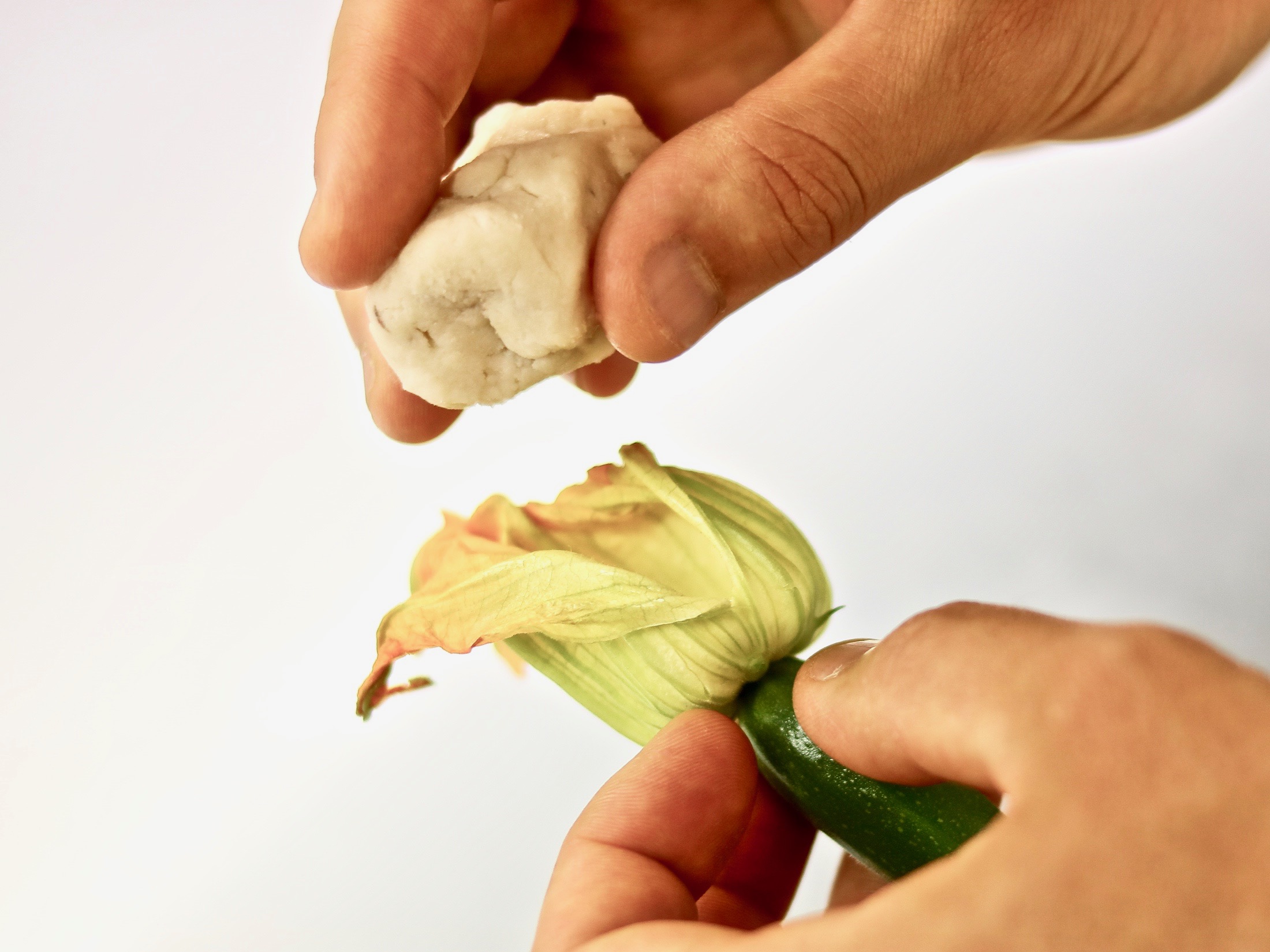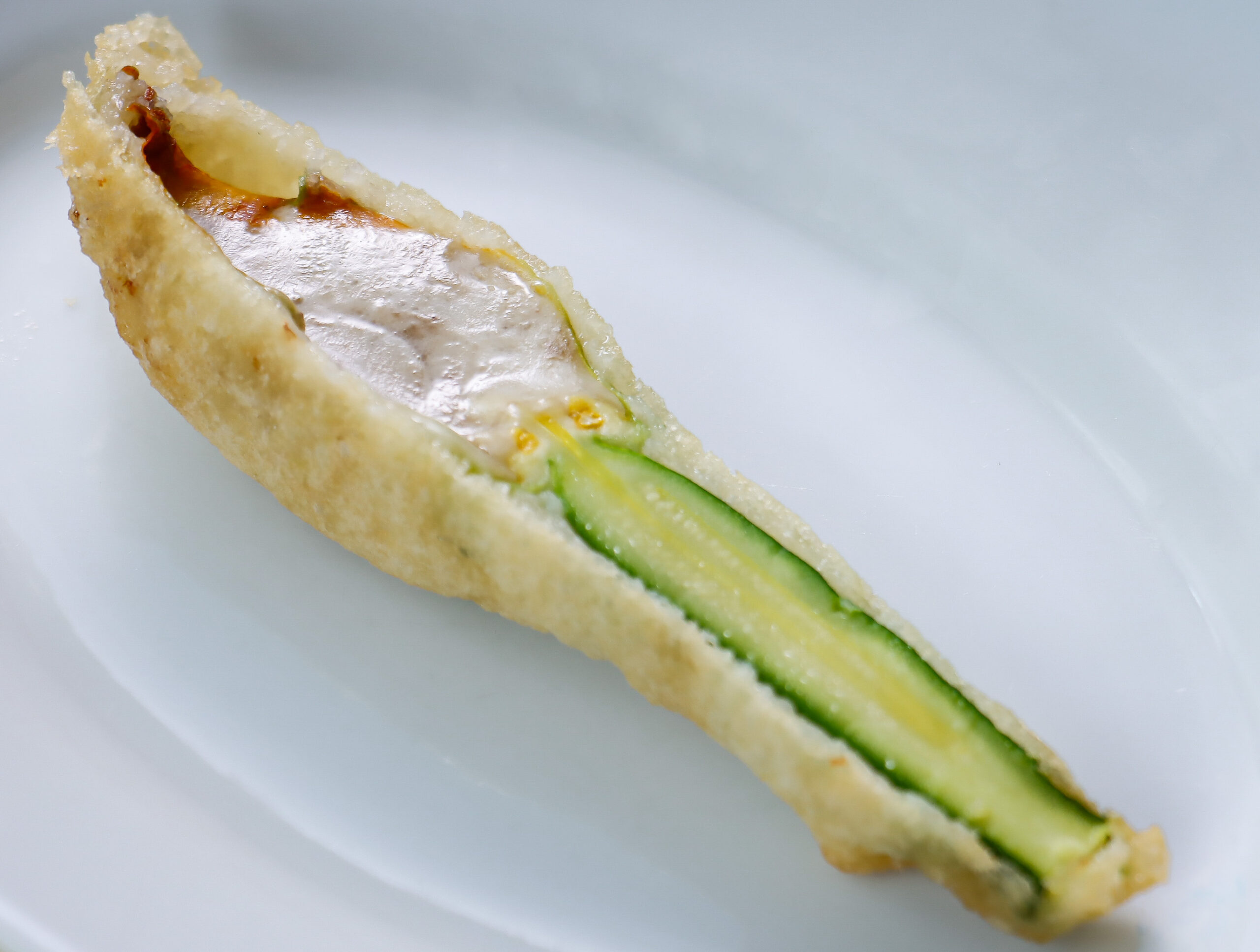 アンチョビを練り込んだモッツァレッラチーズをズッキーニの花の中に詰め 、衣をつけて揚げる