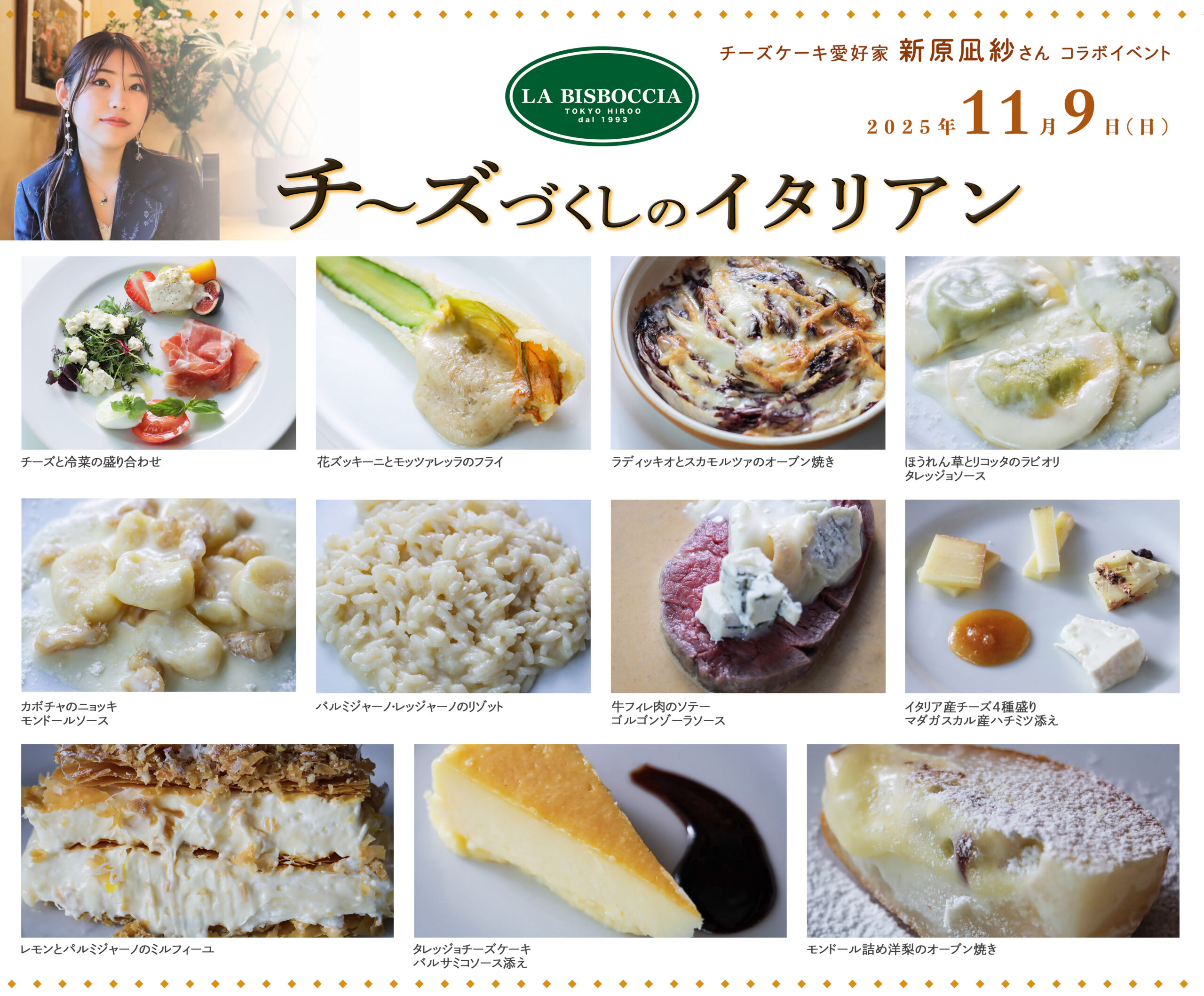 ラ・ビスボッチャは、チーズケーキ愛好家・新原凪紗(にいはらなぎさ)さんとコラボしたイベント「チーズづくしのイタリアン」を2025年11月9日(日)に開催します。
