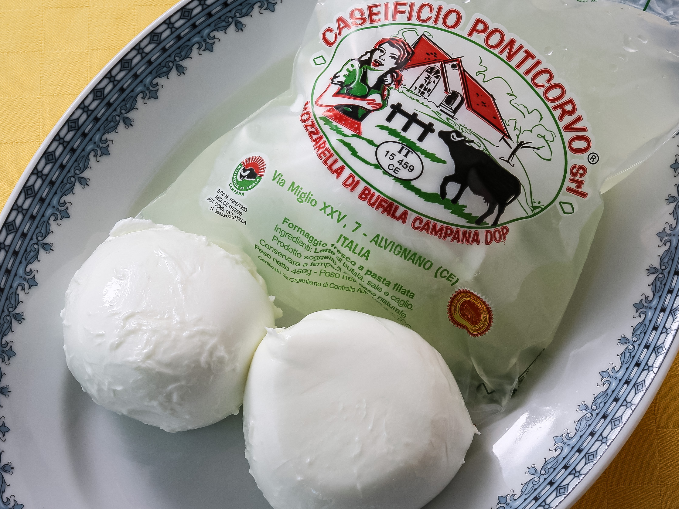 モッツァレラチーズは、特産地のイタリア南部カンパニア州で1968年に創業した「ポンティコルボ」社製。水牛乳を使い、濃厚な風味と食感がある