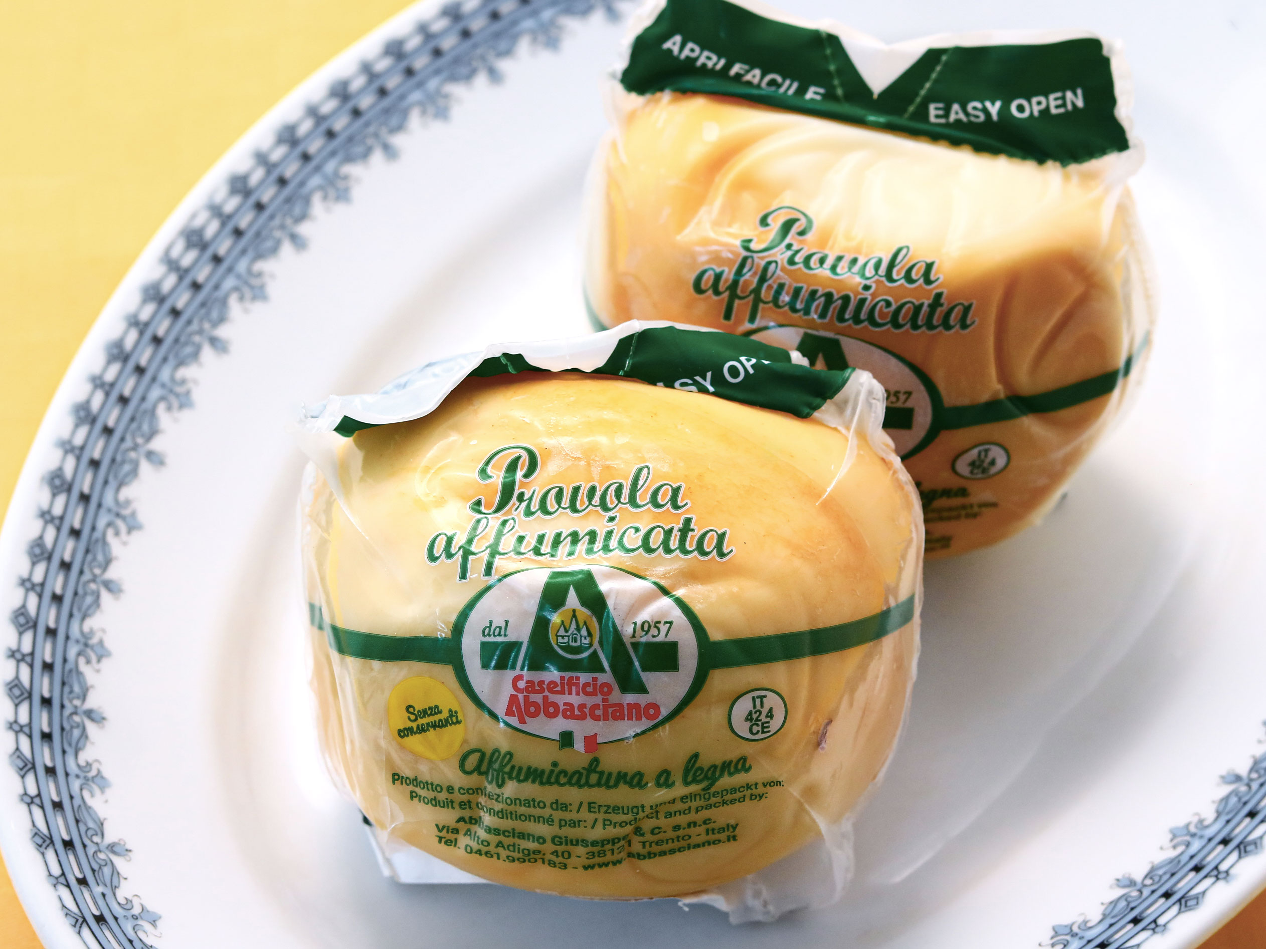 スカモルツァチーズは保存用に水分を少なくして燻製にしたチーズ。加熱すると、もっちりした食感になることから、加熱して食べることが人気になったチーズ。イタリア北部トレンティーノ・アルト・アディジェ州で1957年に創業した「アバシャーノ」社製を使用