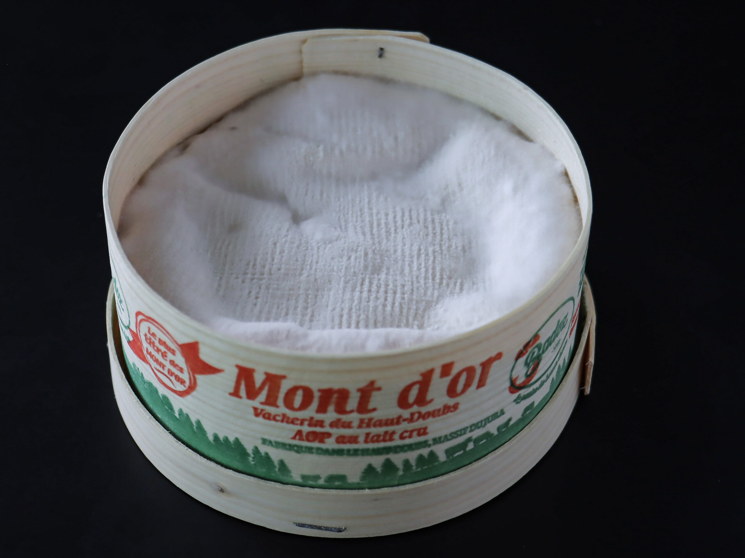 モンドールチーズはフランス中東部ジュラ山脈にある「黄金の山」の意味を持つモンドール一帯で牛乳から作られるウォッシュタイプのチーズ。生産過程でエピセア(マツ科トウヒ属の常緑針葉樹)の樹皮に巻き、塩水で何度も洗った後、エピセアの棚で熟成し、エピセアの木箱に入れて出荷する。外皮は厚めで、中身はとろりと柔らかく、木材の風味とまろやかな甘みや酸味が繊細に広がる