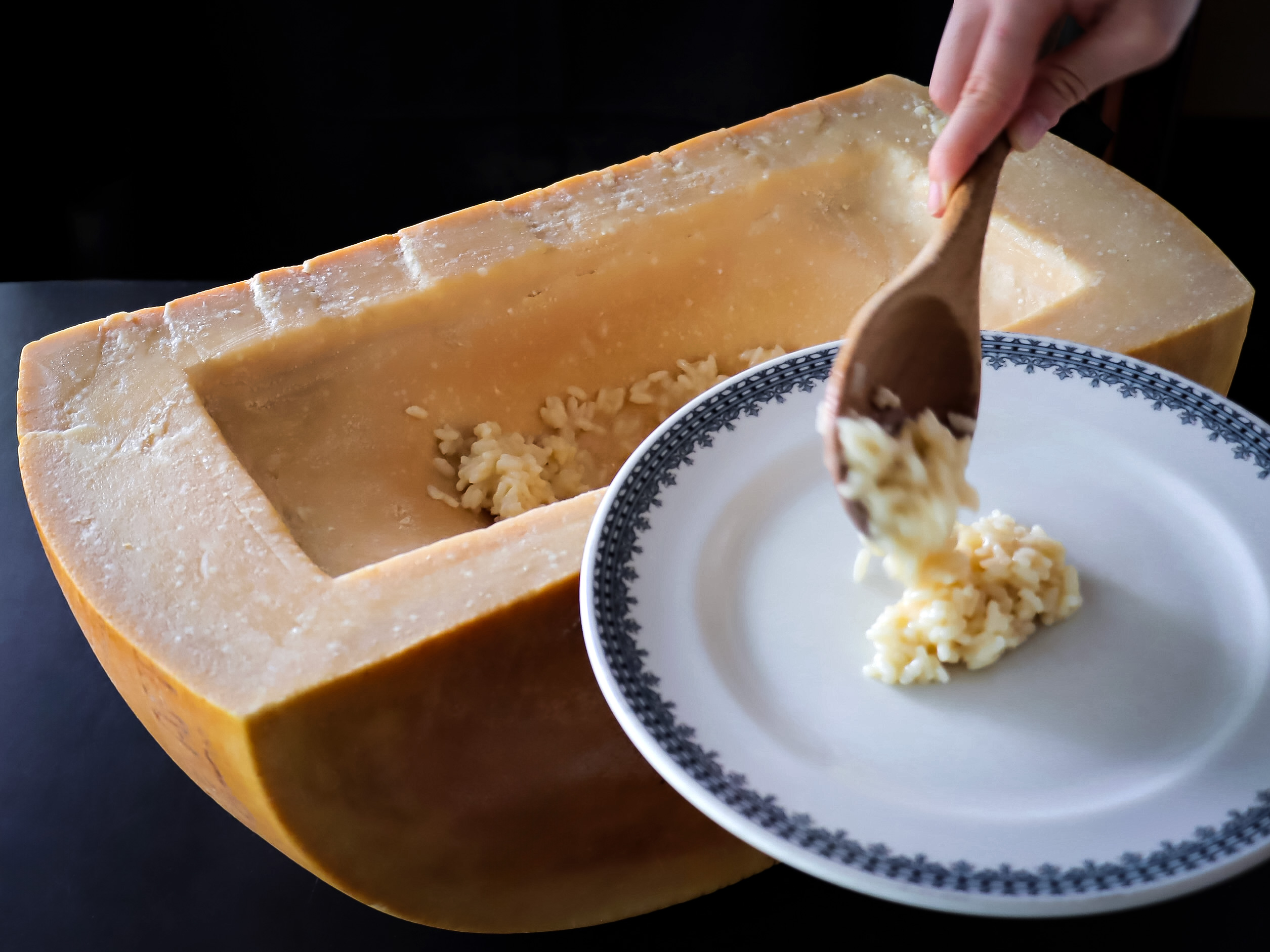 煮込んだリゾットをパルミジャーノ・レッジャーノの塊の中で混ぜ、香りとチーズをつけて仕上げる