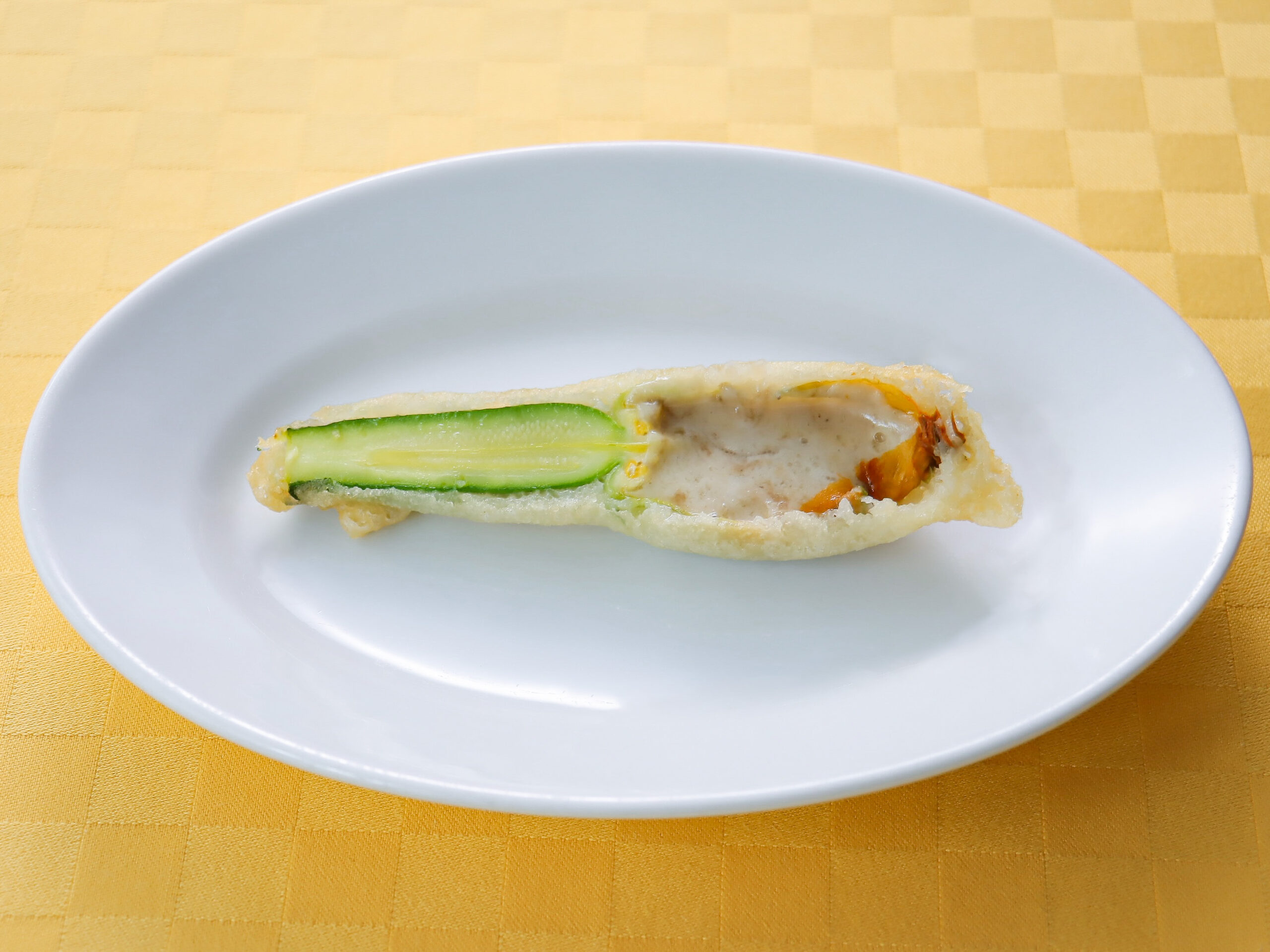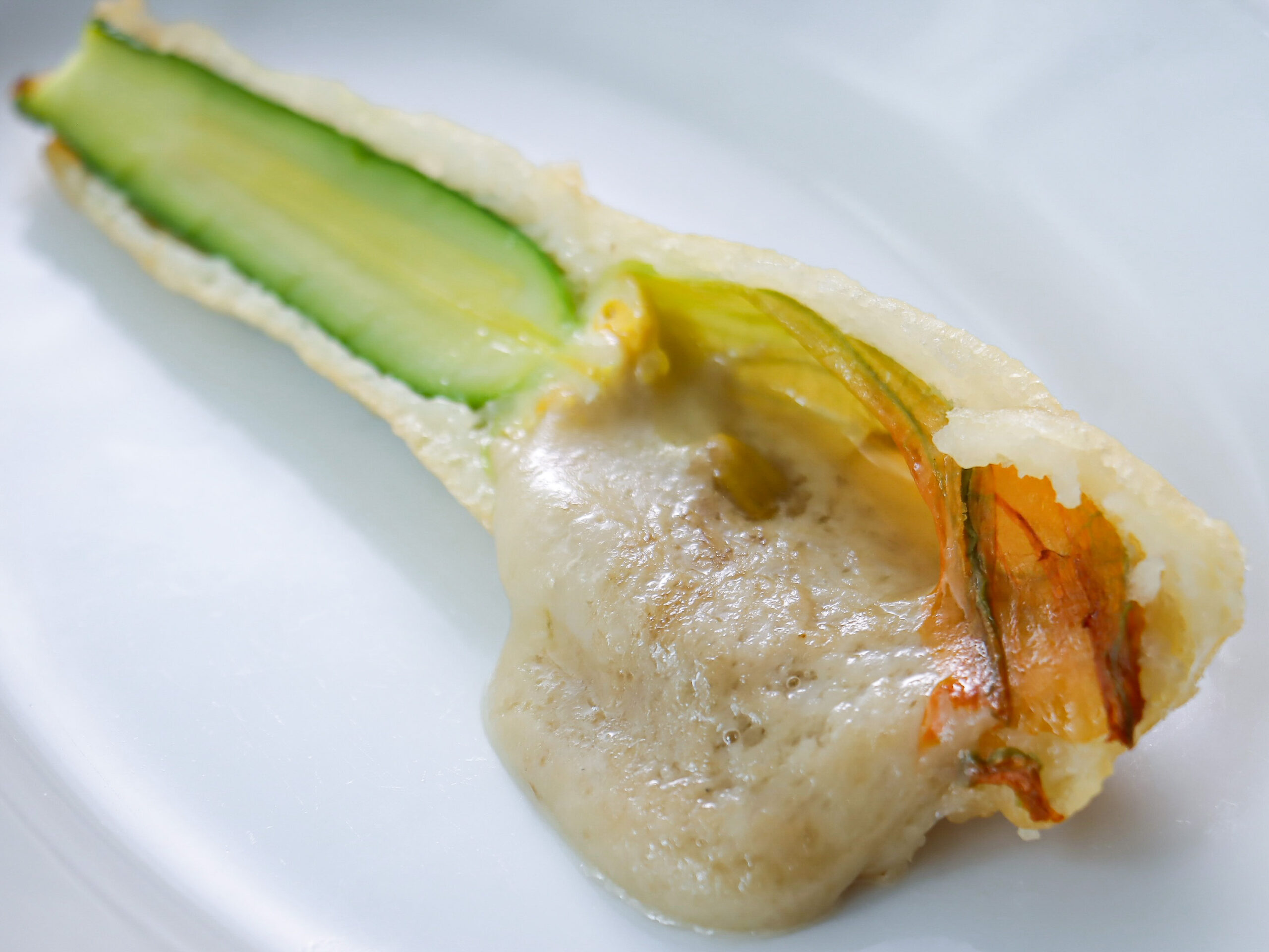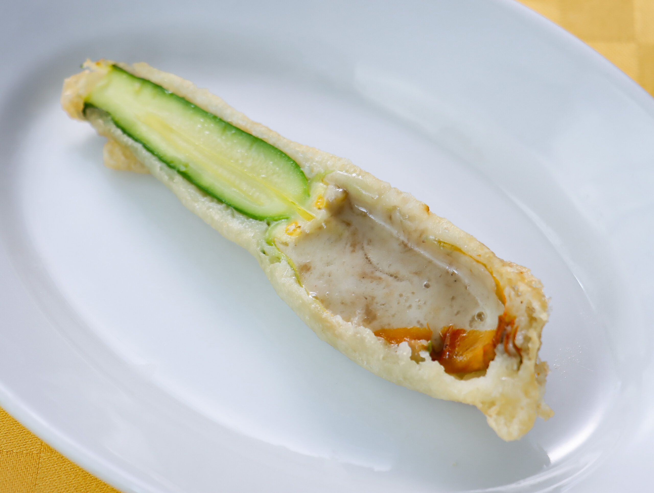 ズッキーニの花の中に、アンチョビを練り込んだモッツァレッラチーズを詰め、衣をつけ、ふっくら揚げました。