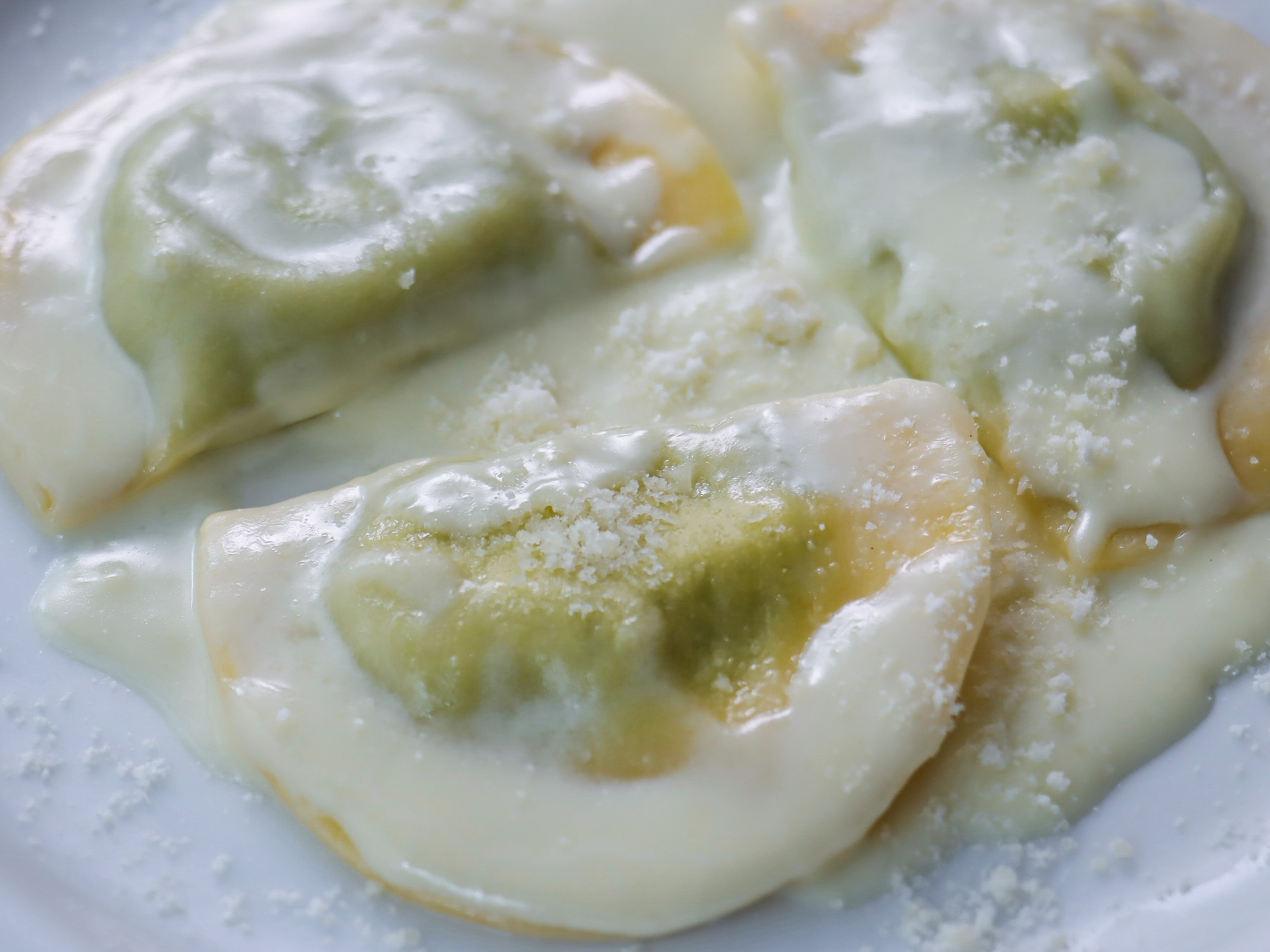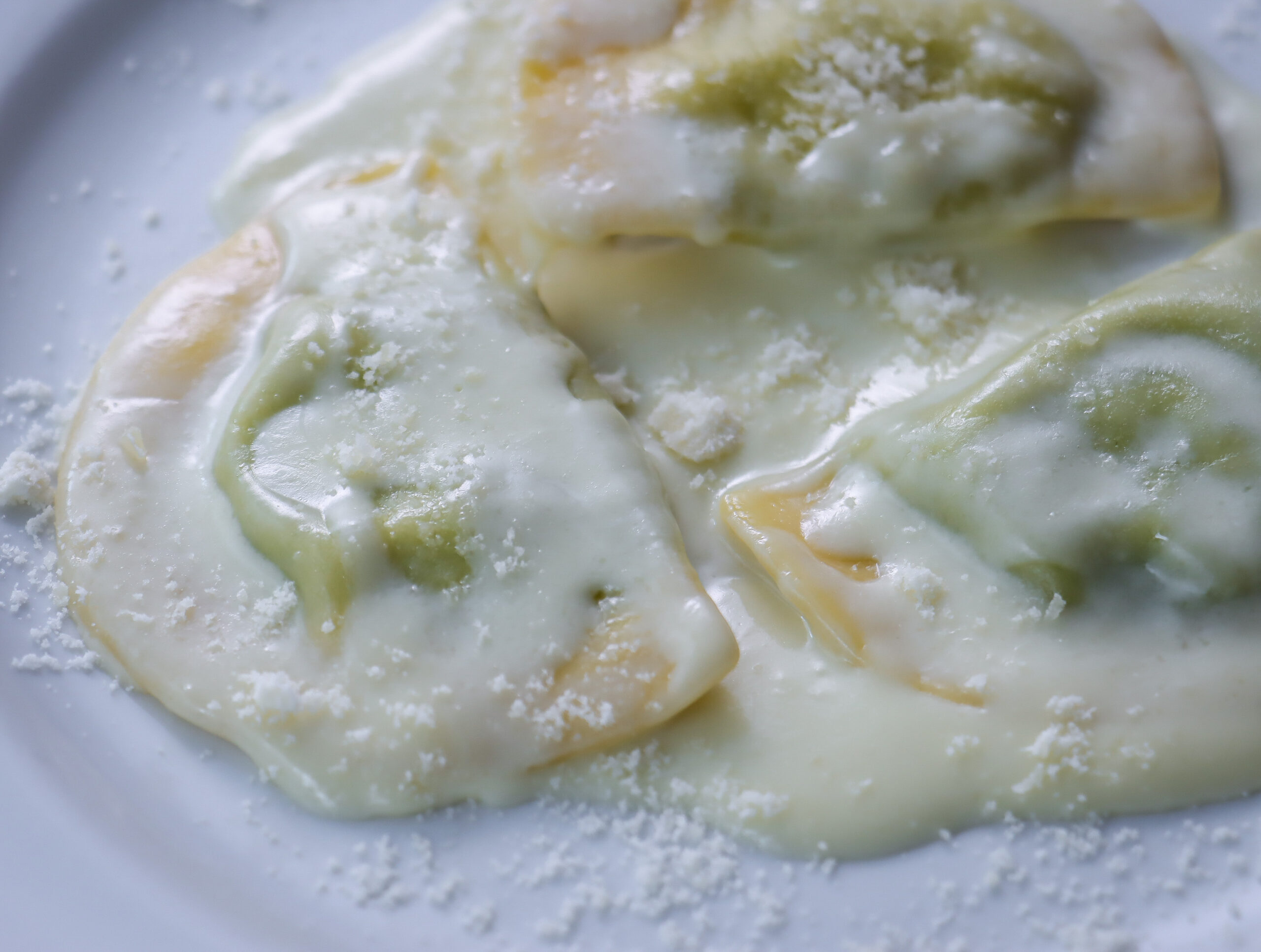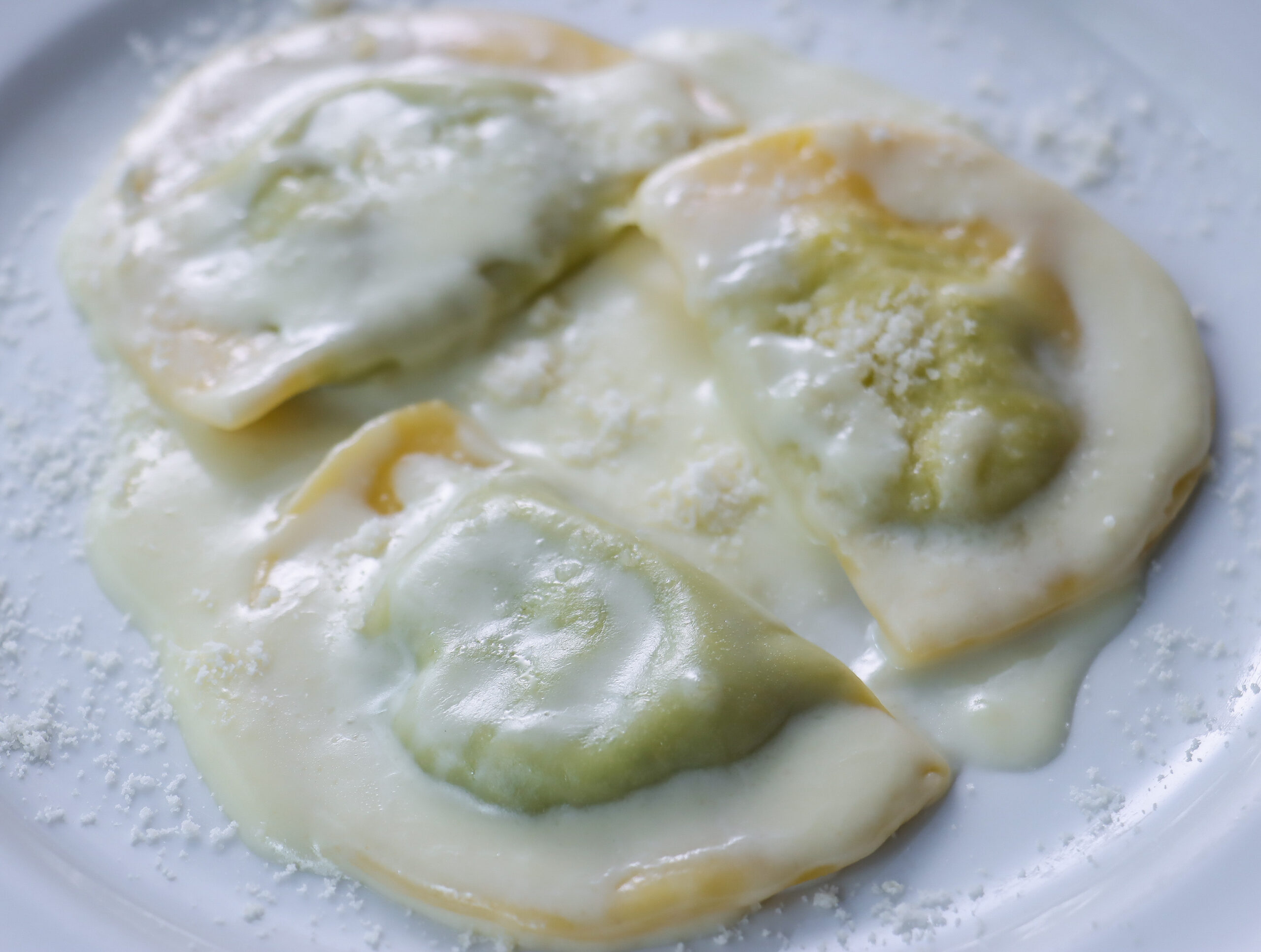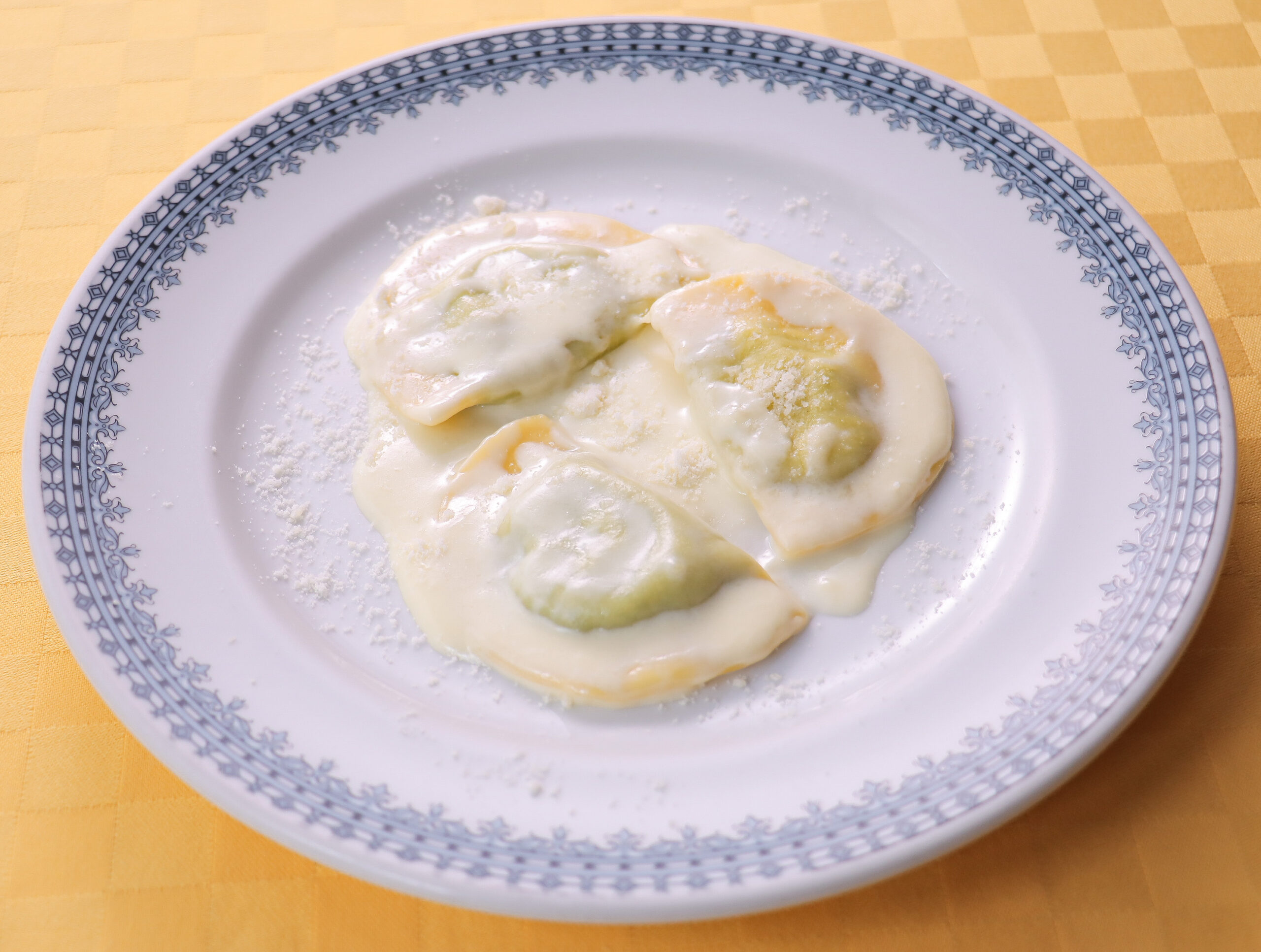 ほうれん草とリコッタチーズを混ぜたペースト入りのラビオリに、タレッジョチーズ、生クリーム、無塩バターで作るソースを合わせ、パルミジャーノ・レッジャーノを振りかけて仕上げました。