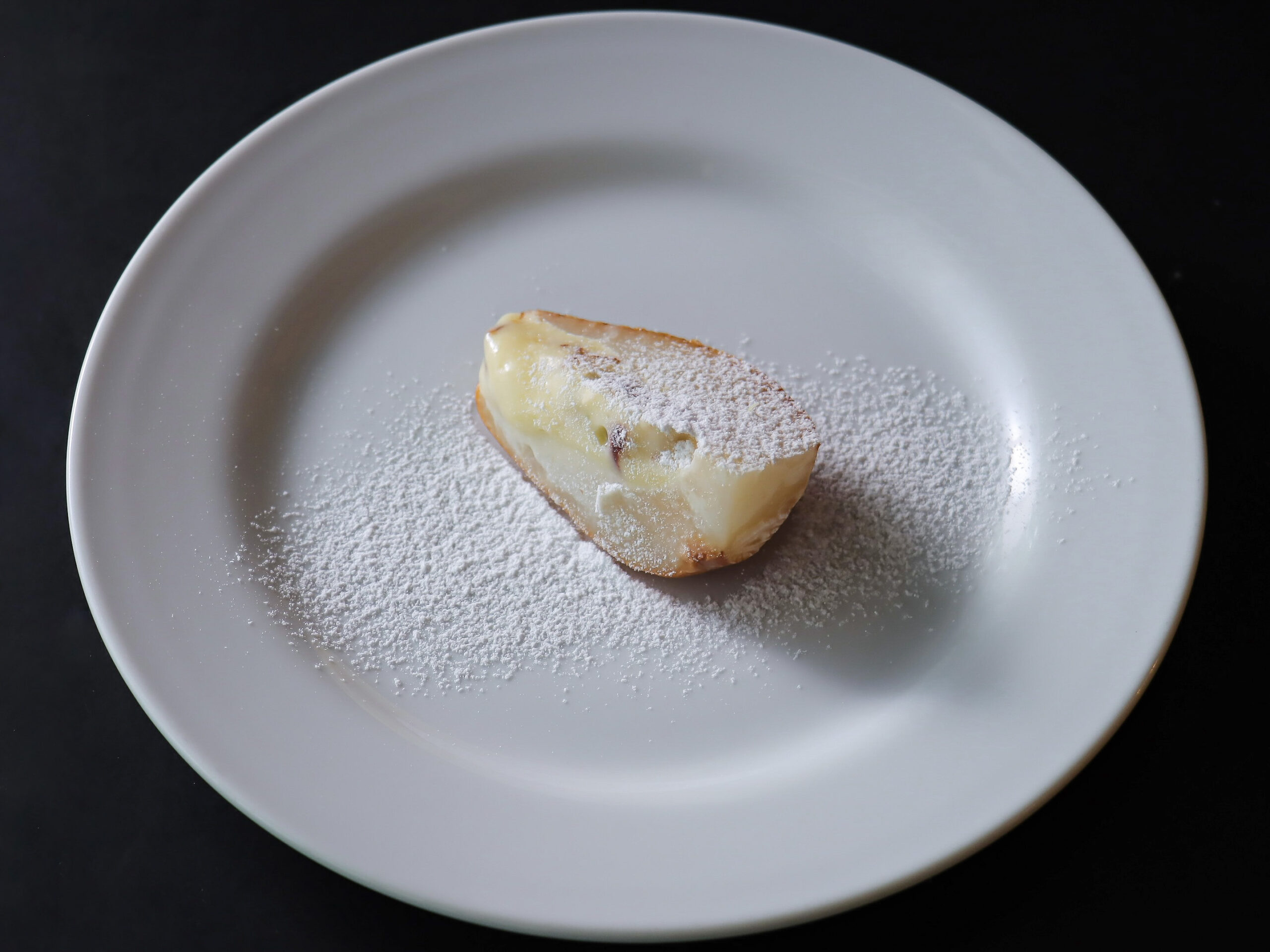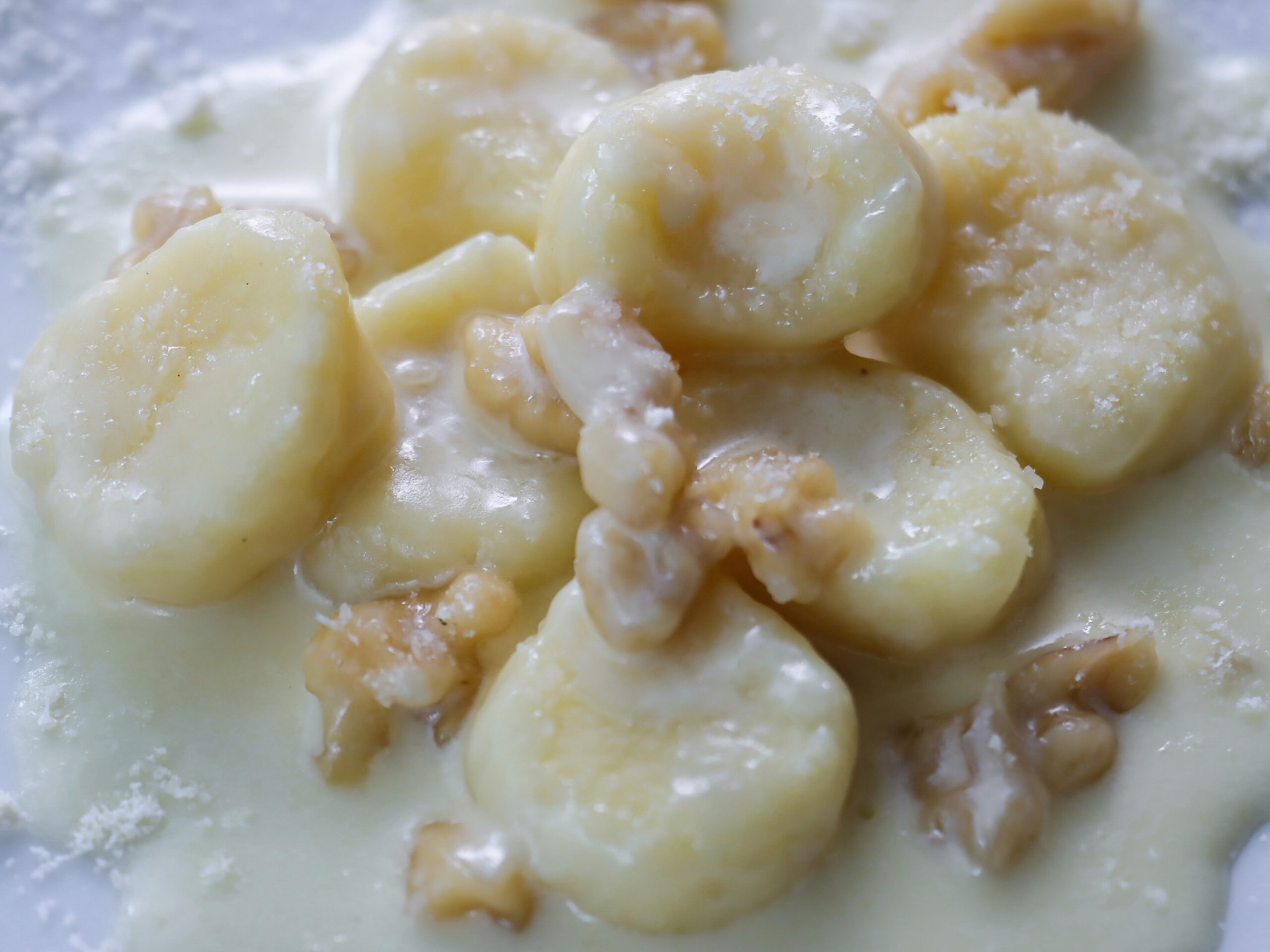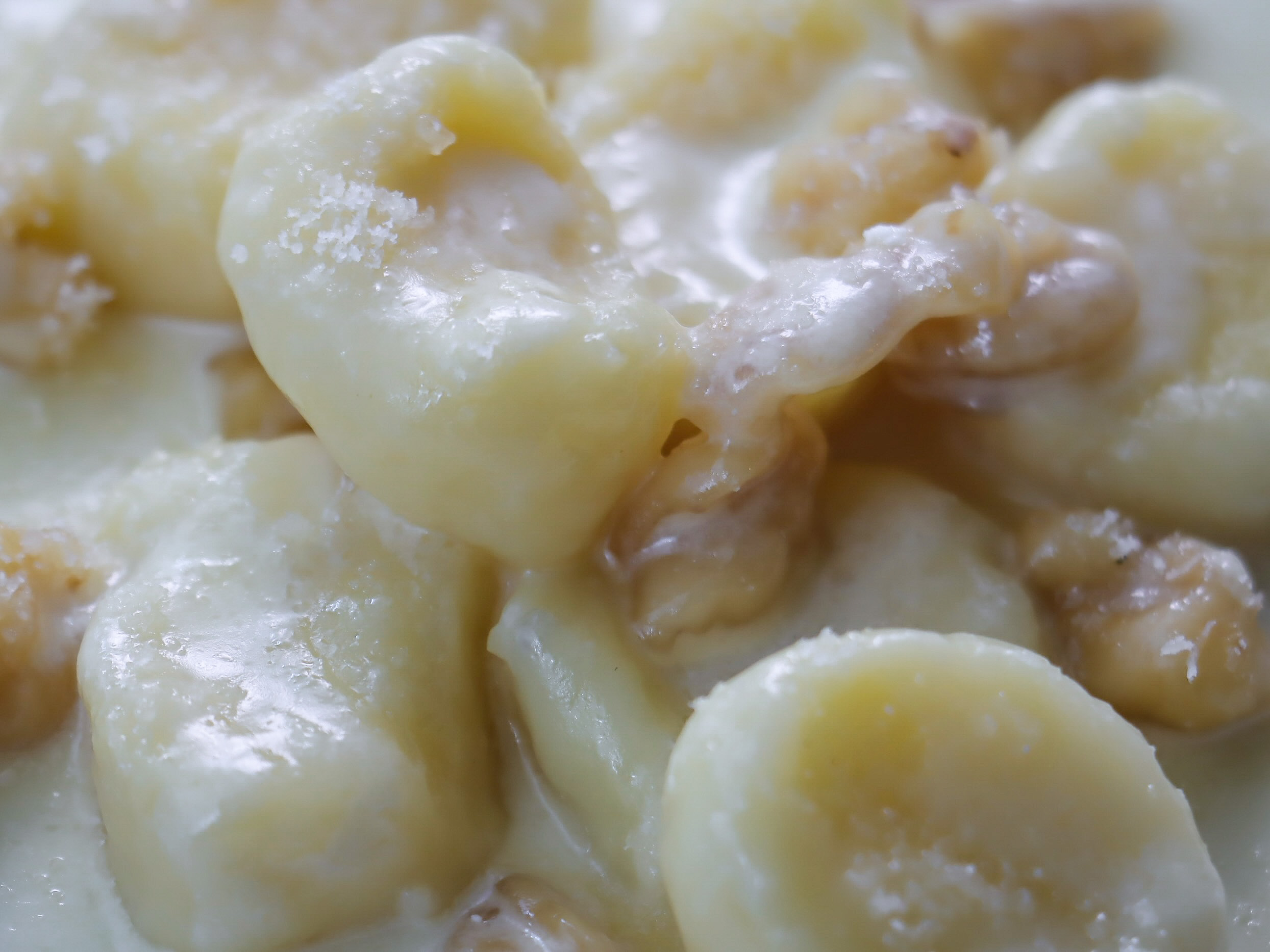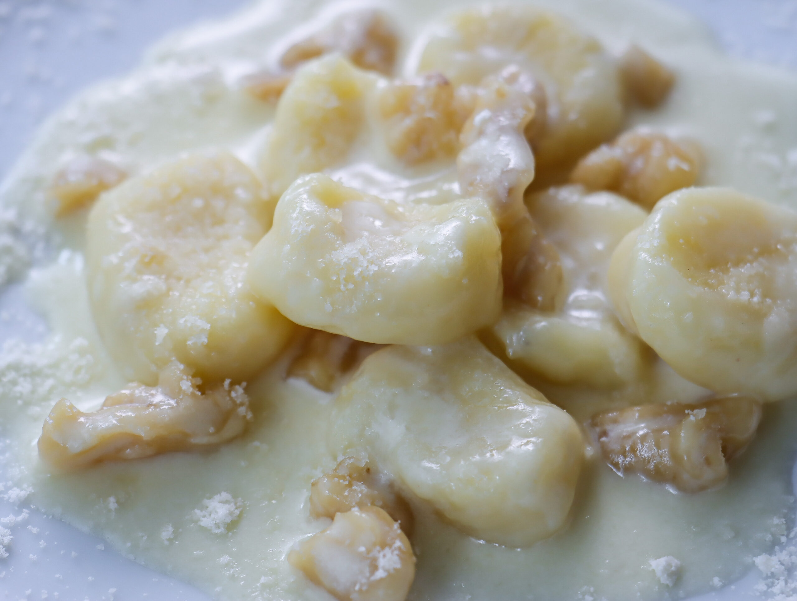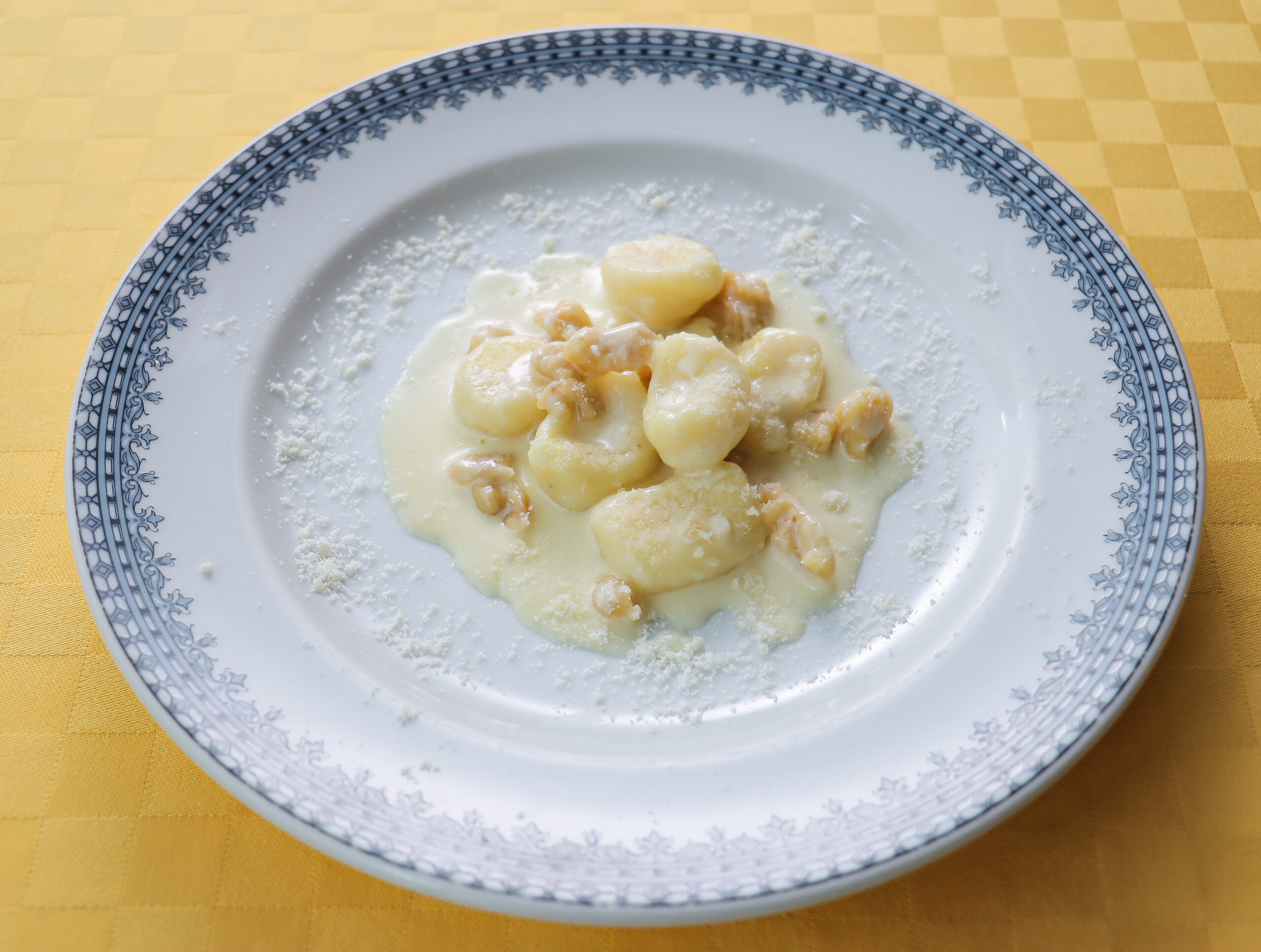 カボチャのニョッキに、モンドールチーズと生クリーム、無塩バター、クルミで作るソースを合わせ、パルミジャーノ・レッジャーノを振りかけて仕上げました。