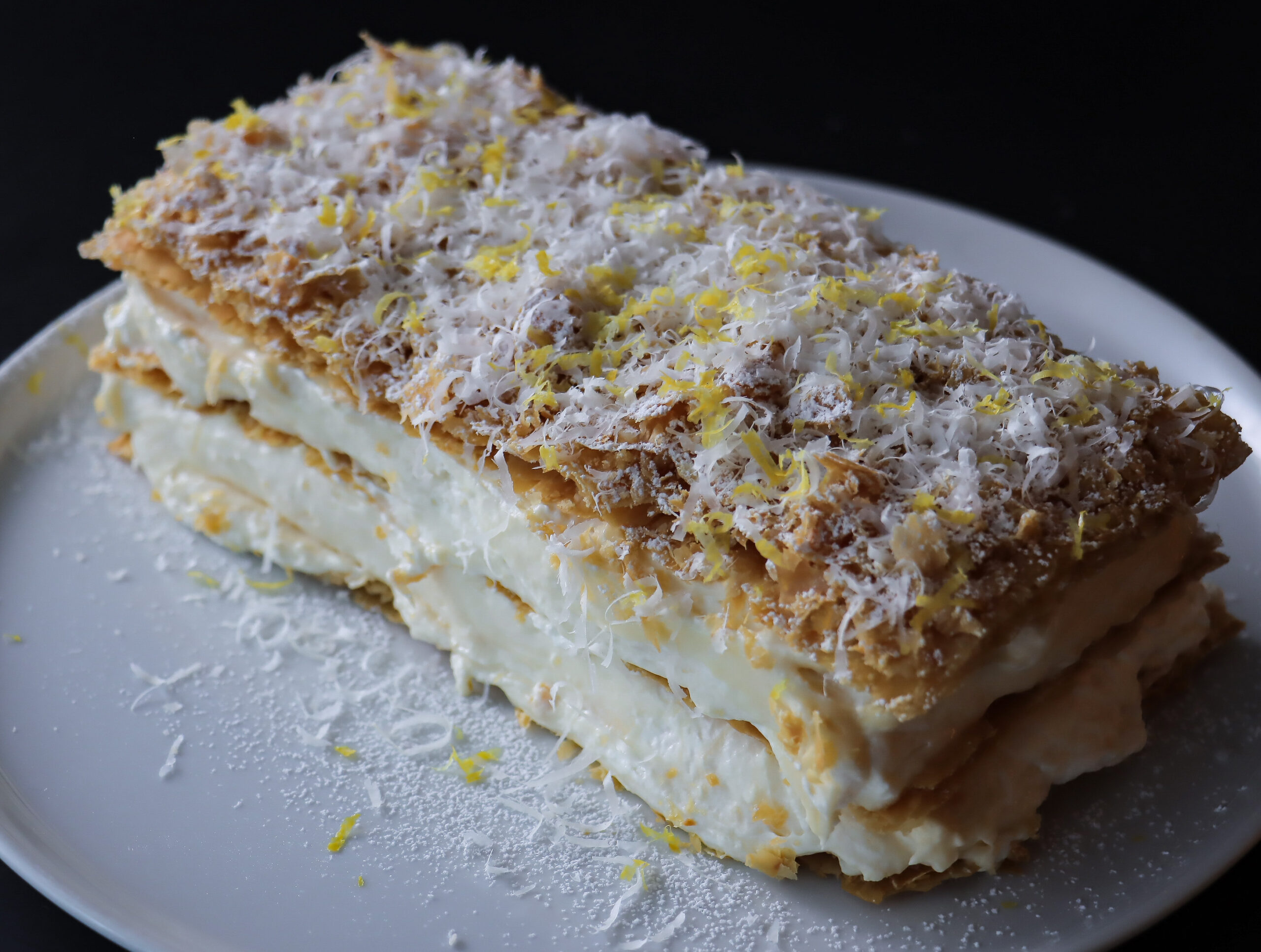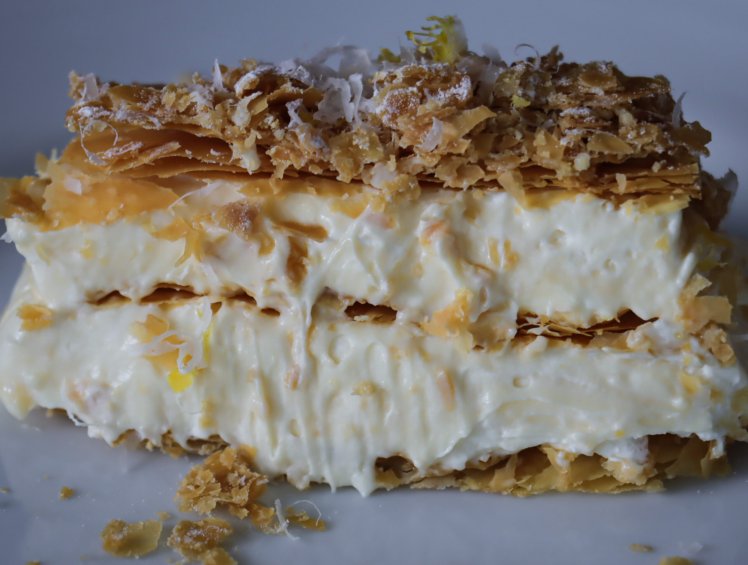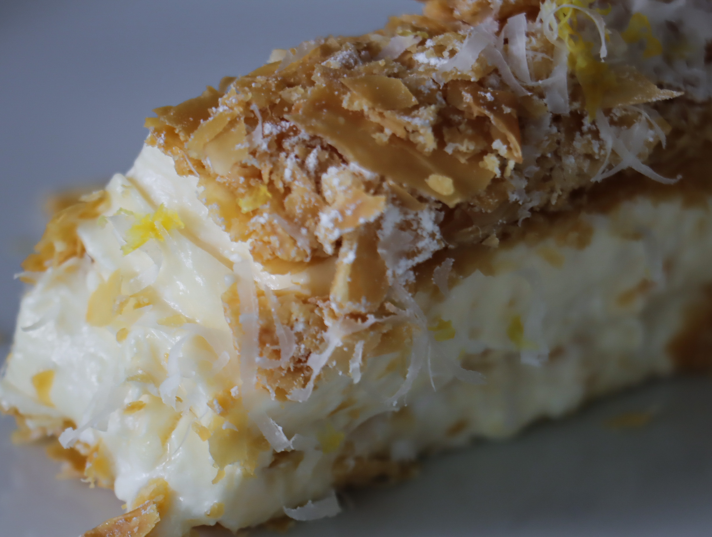パルミジャーノ・レッジャーノのクリーム(パルミジャーノ・レッジャーノ、クリームチーズ、カスタードクリーム、ホイップクリーム、砂糖)をレモンジャムを塗ったパイ生地と重ね、パルミジャーノ・レッジャーノとレモンの皮、粉糖を振りかけて仕上げました。