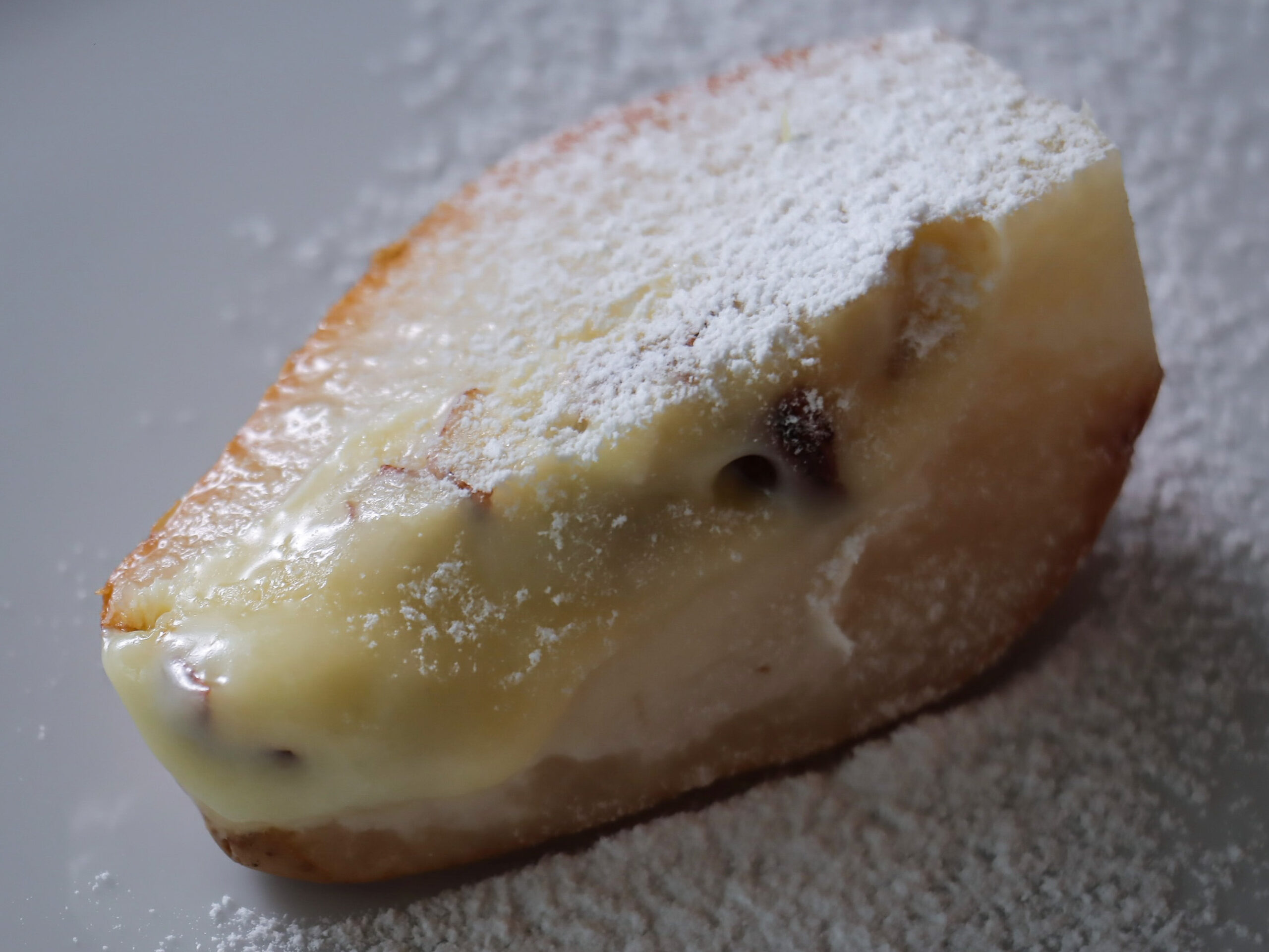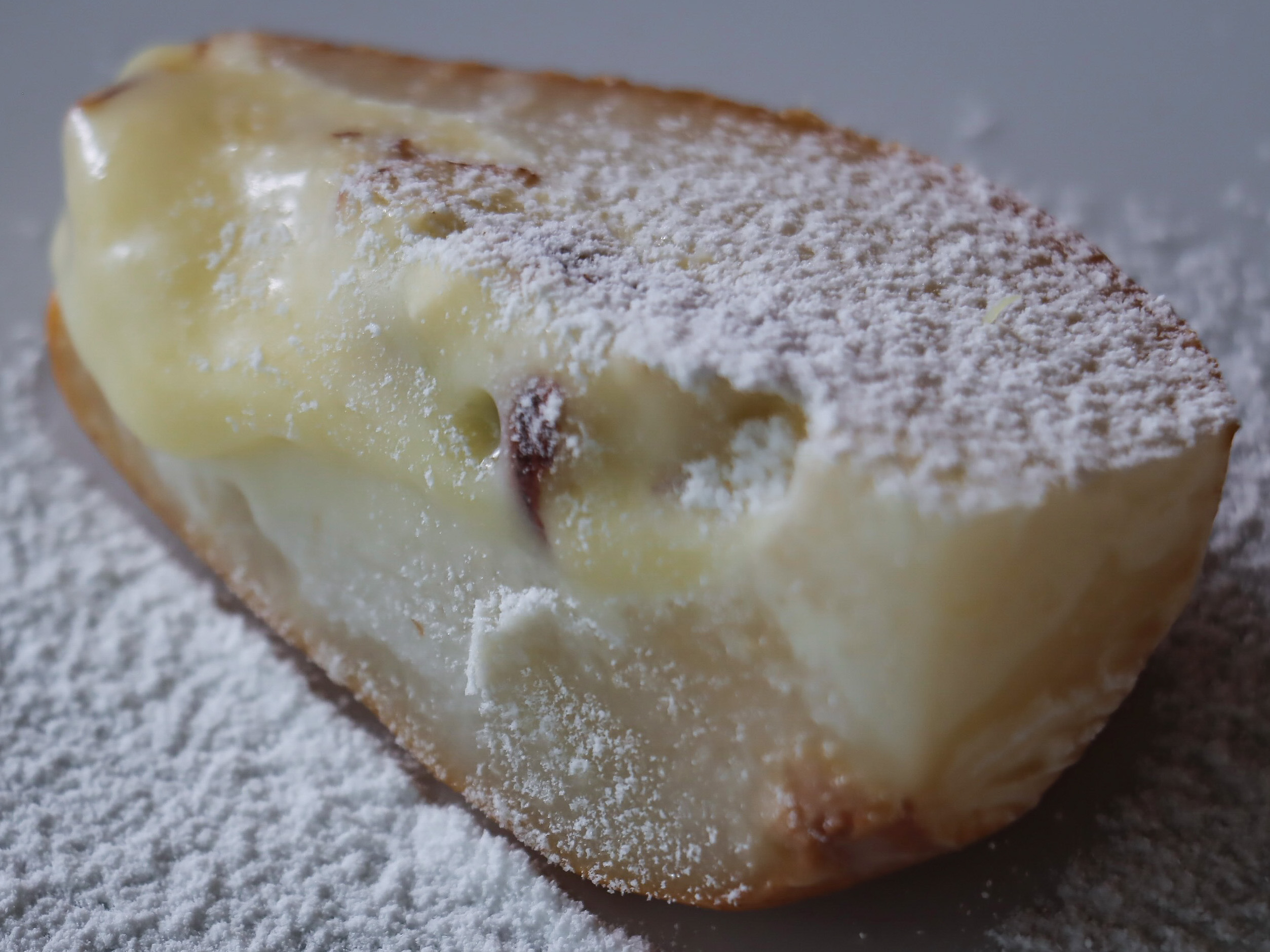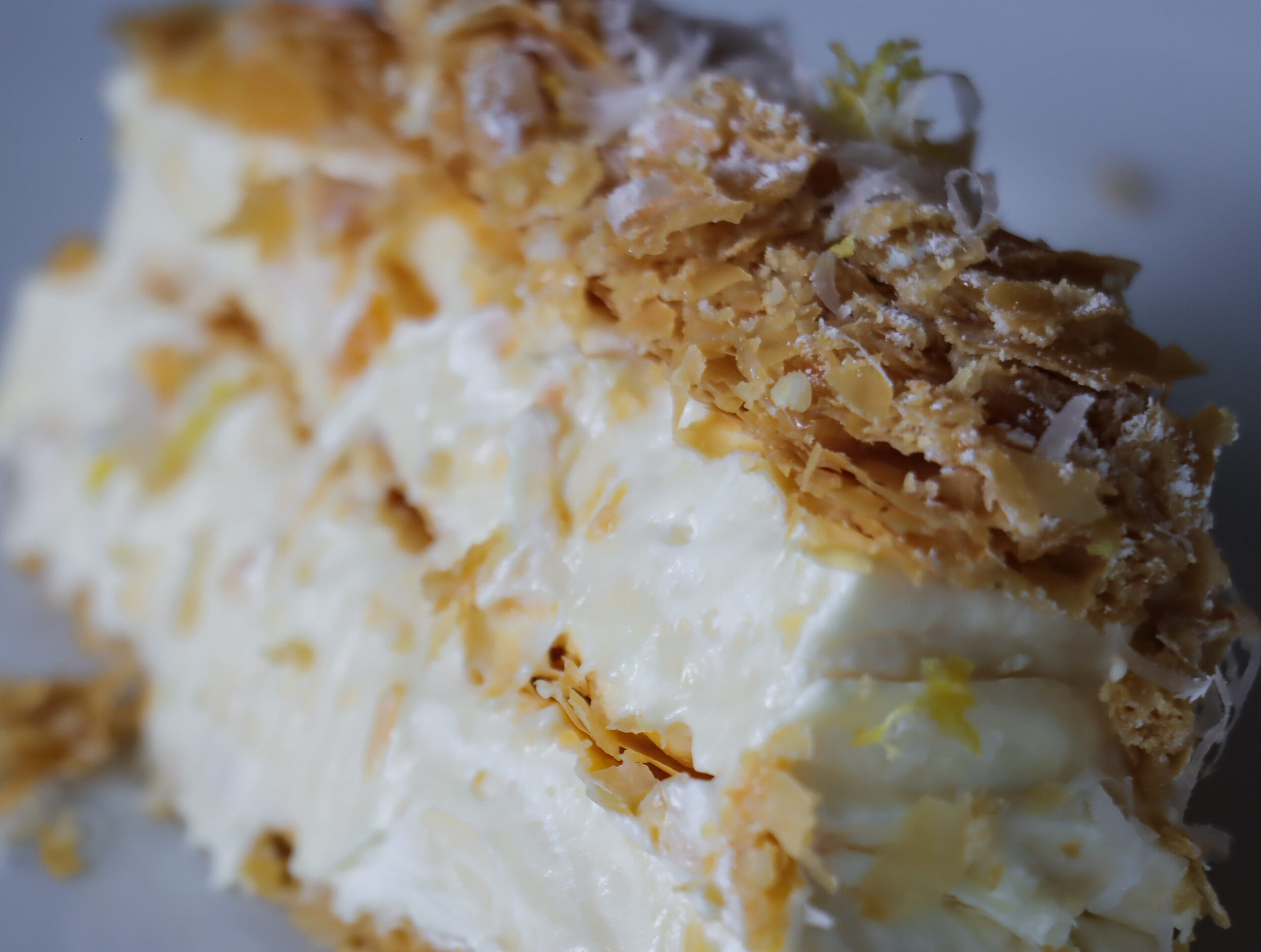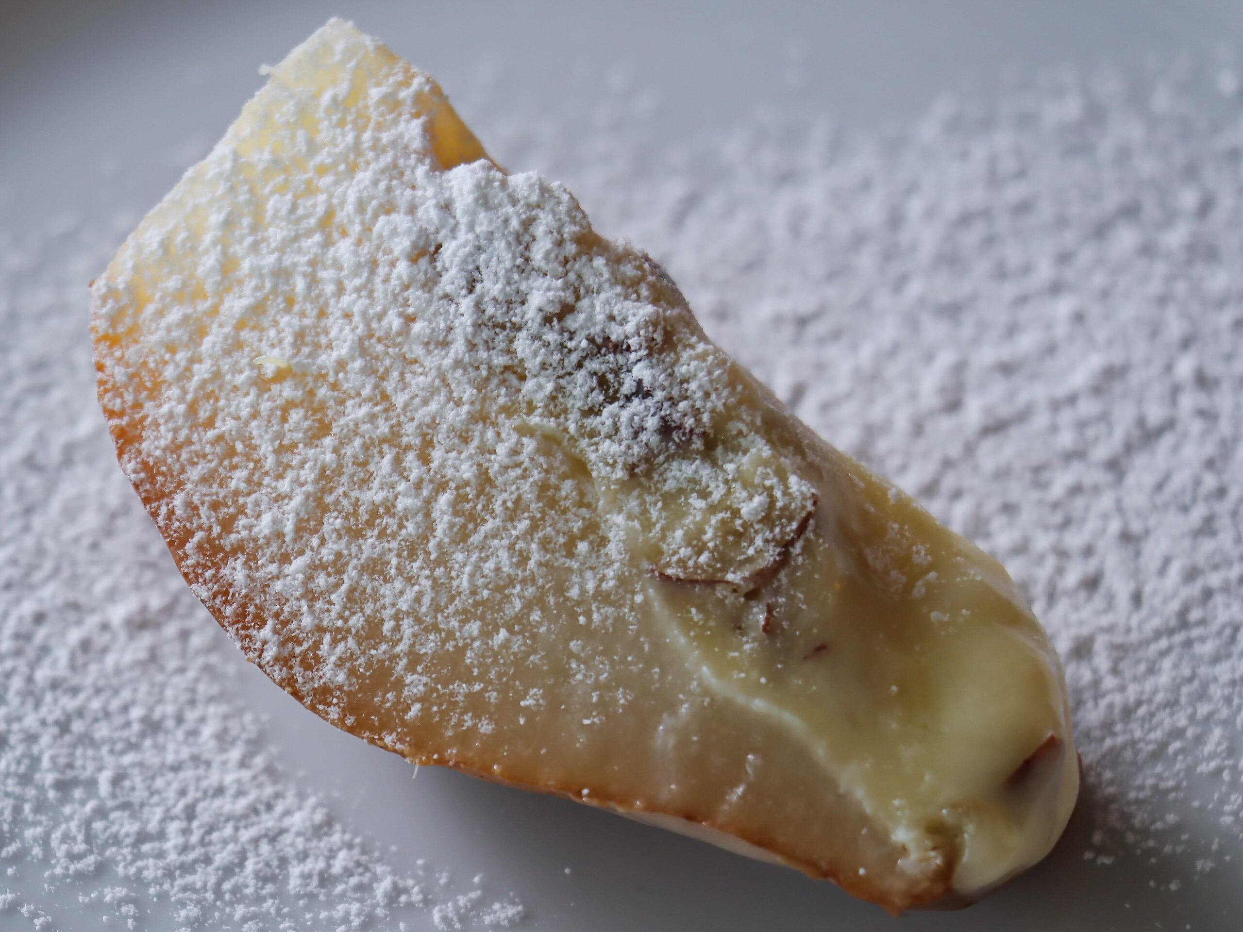 パルミジャーノ・レッジャーノのクリーム(パルミジャーノ・レッジャーノ、クリームチーズ、カスタードクリーム、ホイップクリーム、砂糖)をレモンジャムを塗ったパイ生地と重ね、パルミジャーノ・レッジャーノとレモンの皮、粉糖を振りかけて仕上げました。
