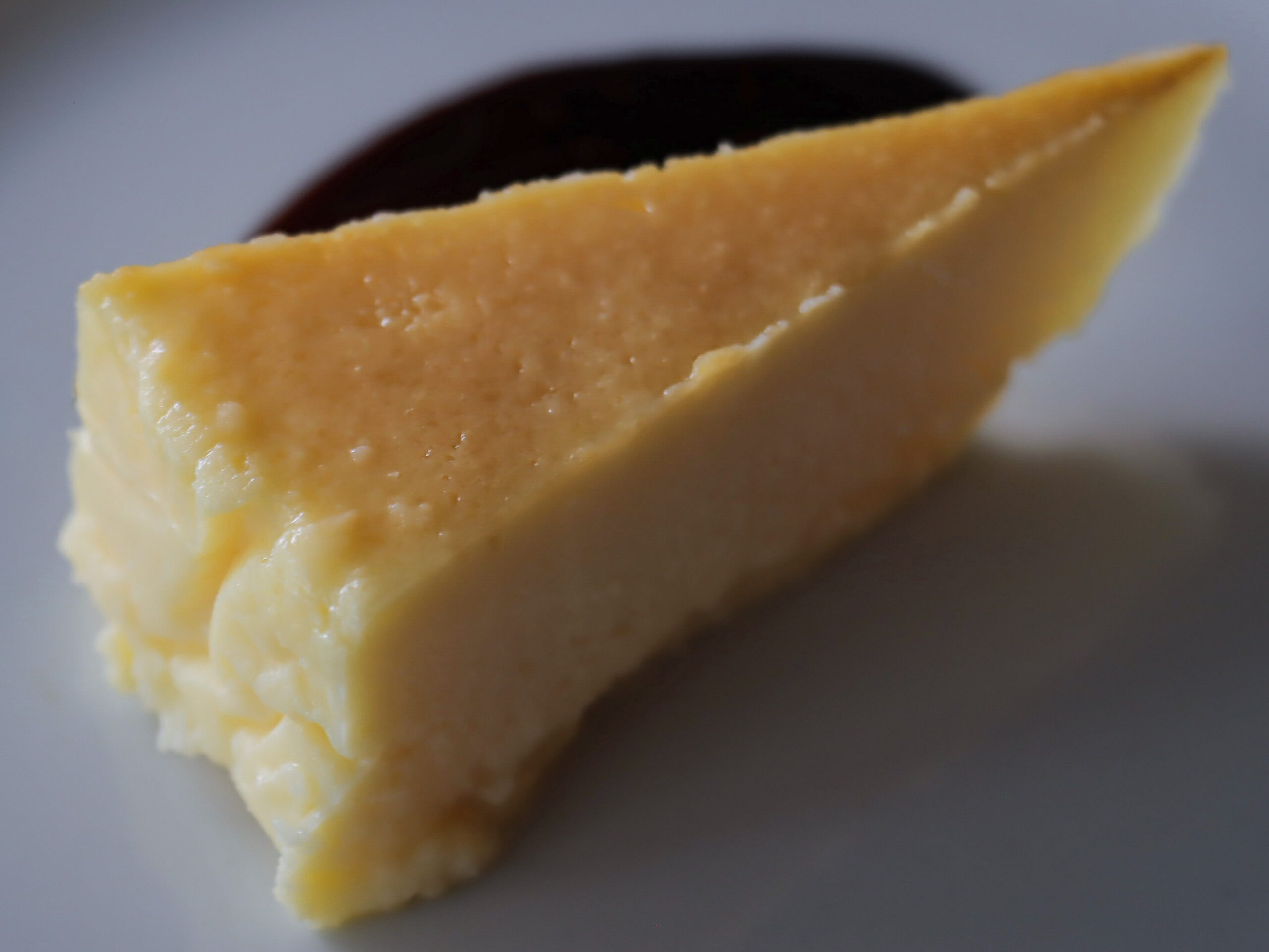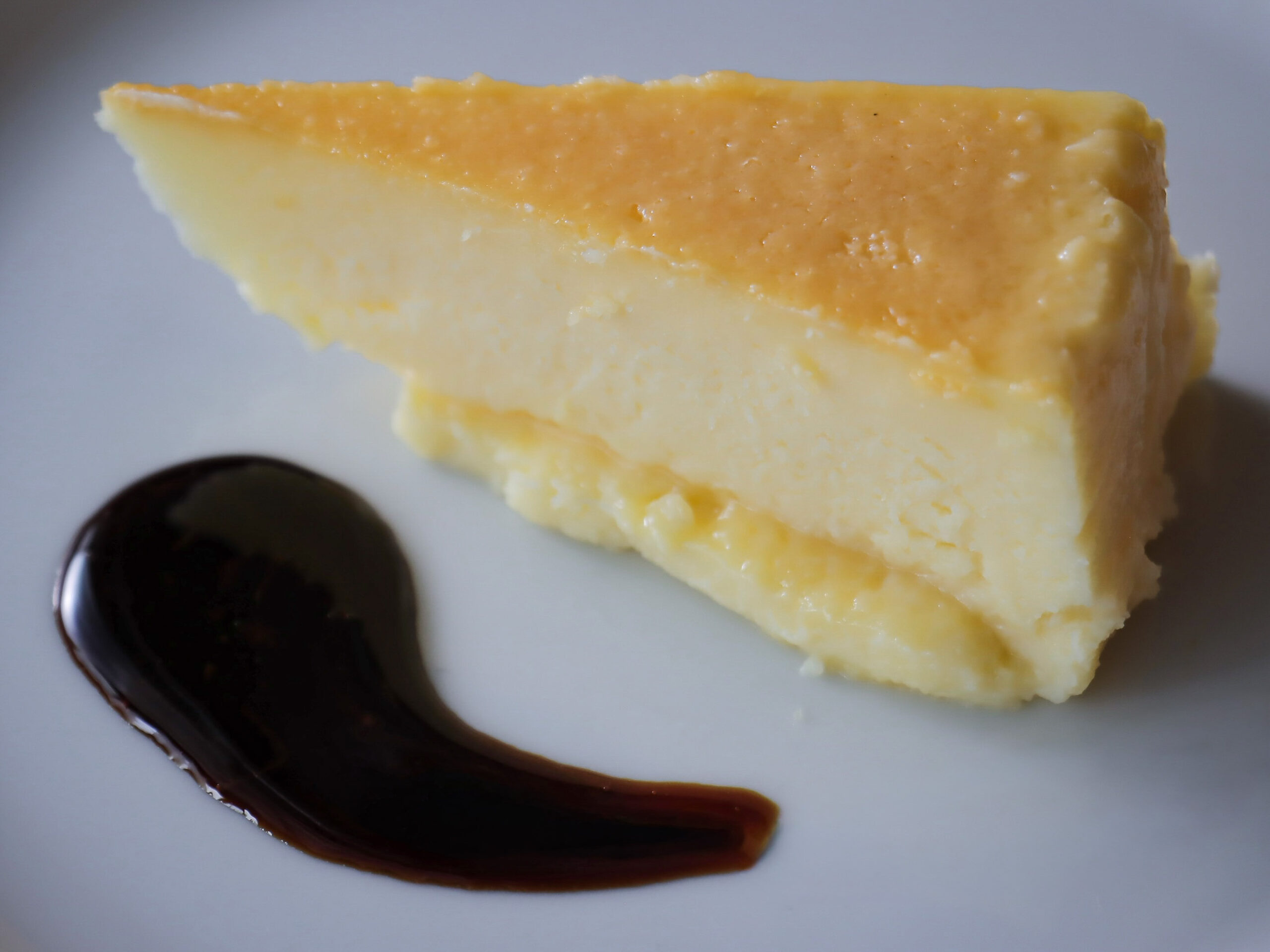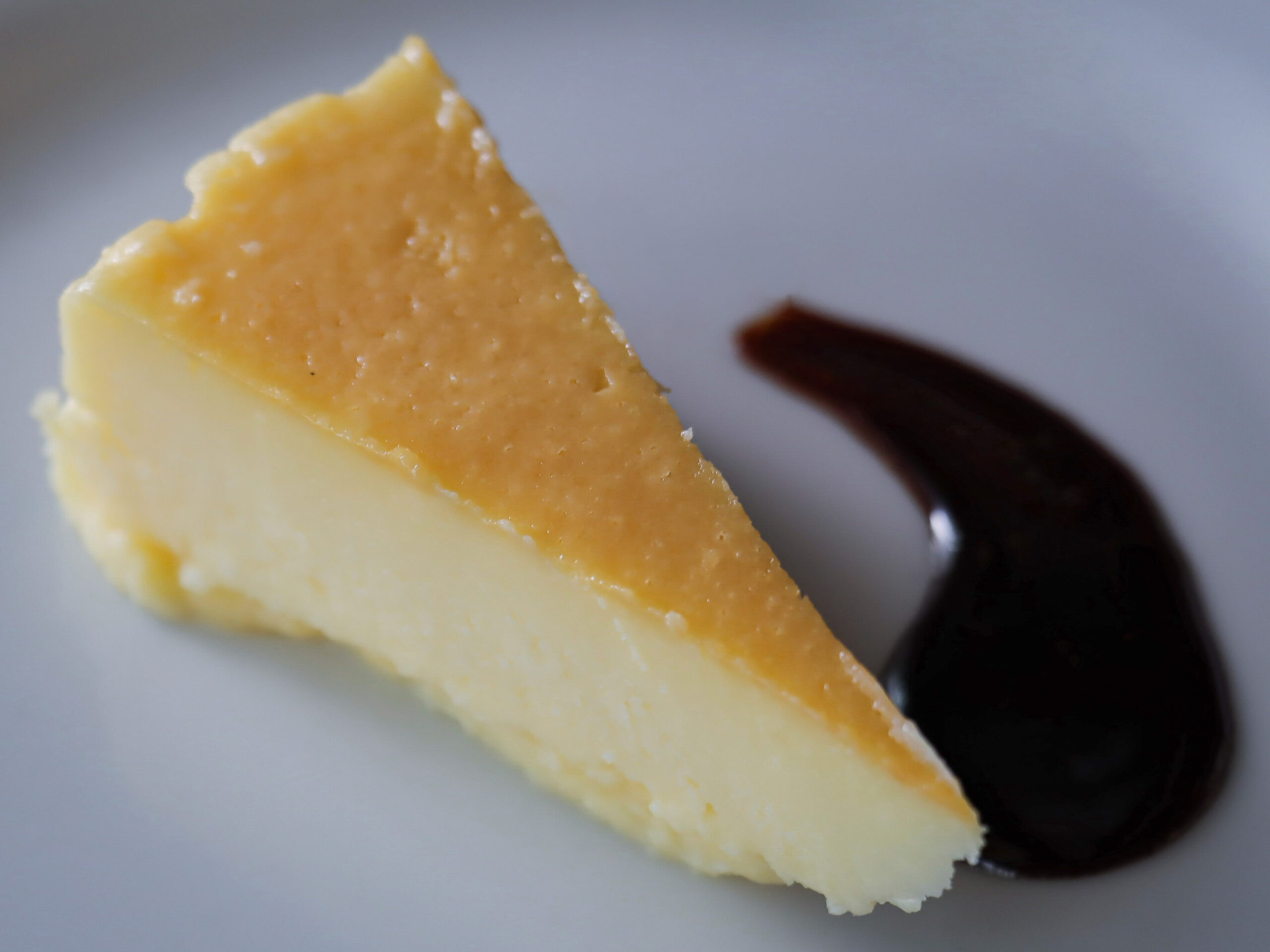 タレッジョチーズの生地(タレッジョチーズ、クリームチーズ、サワークリーム、卵、牛乳、生クリーム、コーンスターチ、砂糖)を焼き、イタリア産のバルサミコ酢で作る甘酸っぱいソースを添えました。