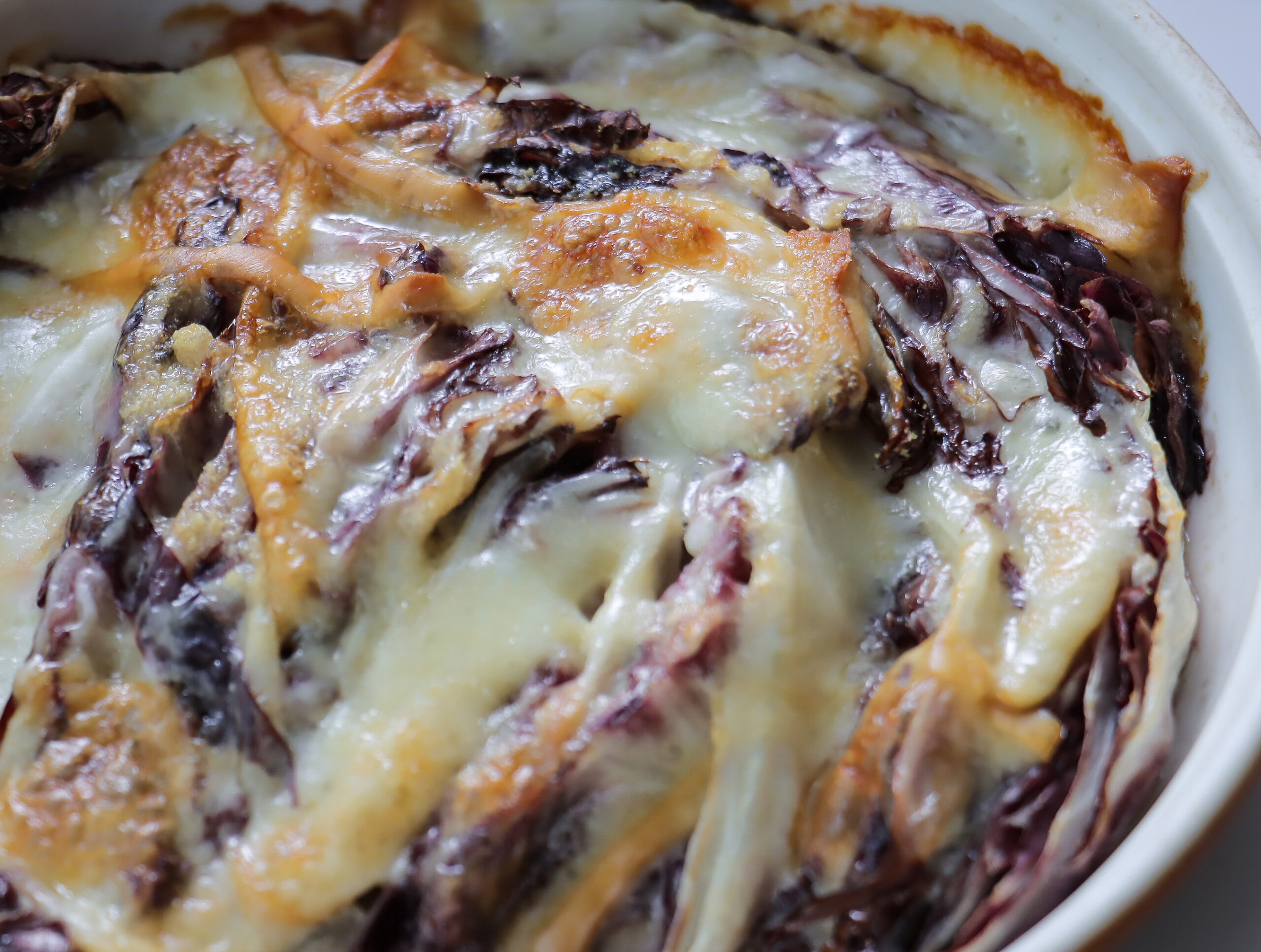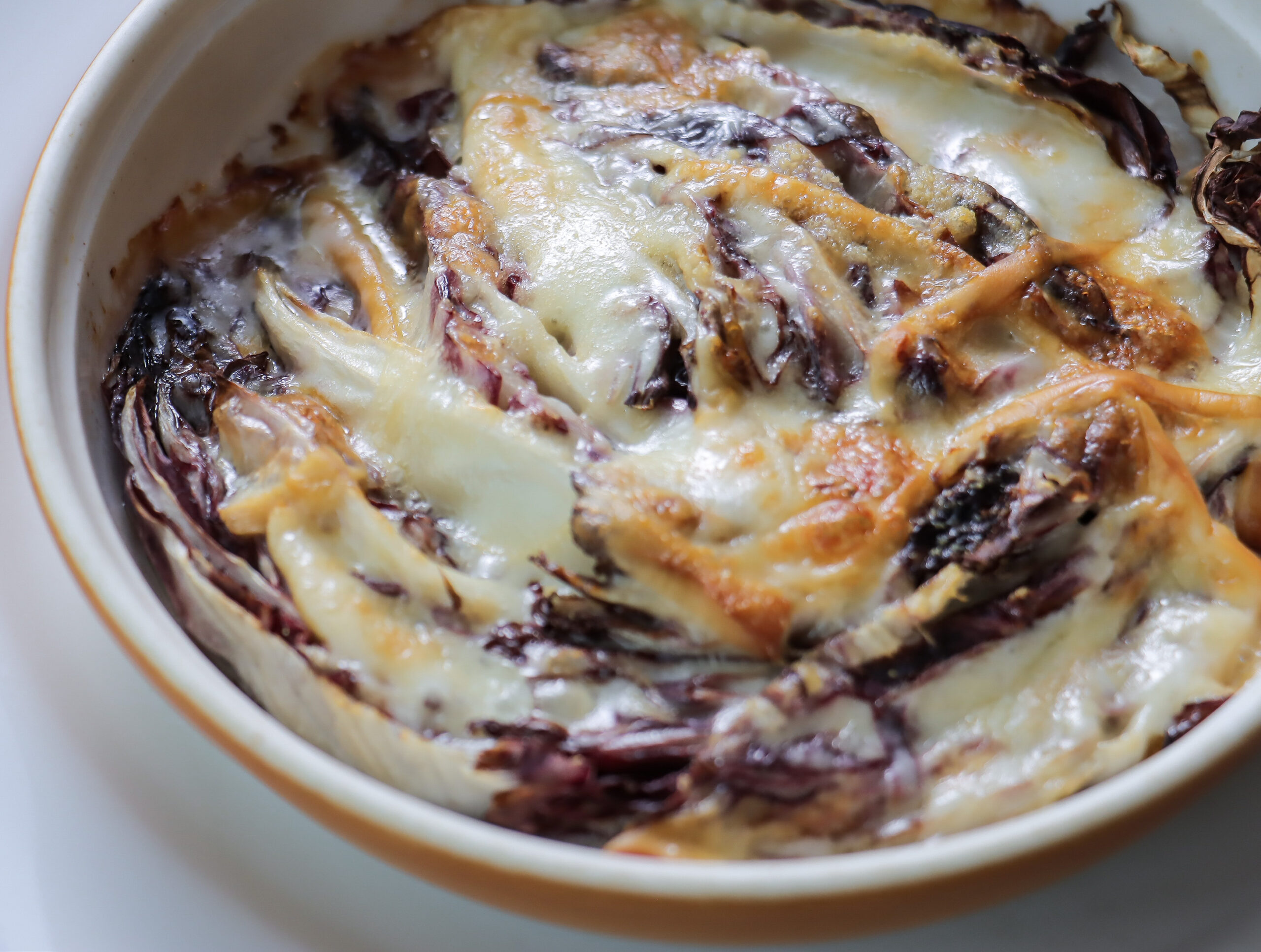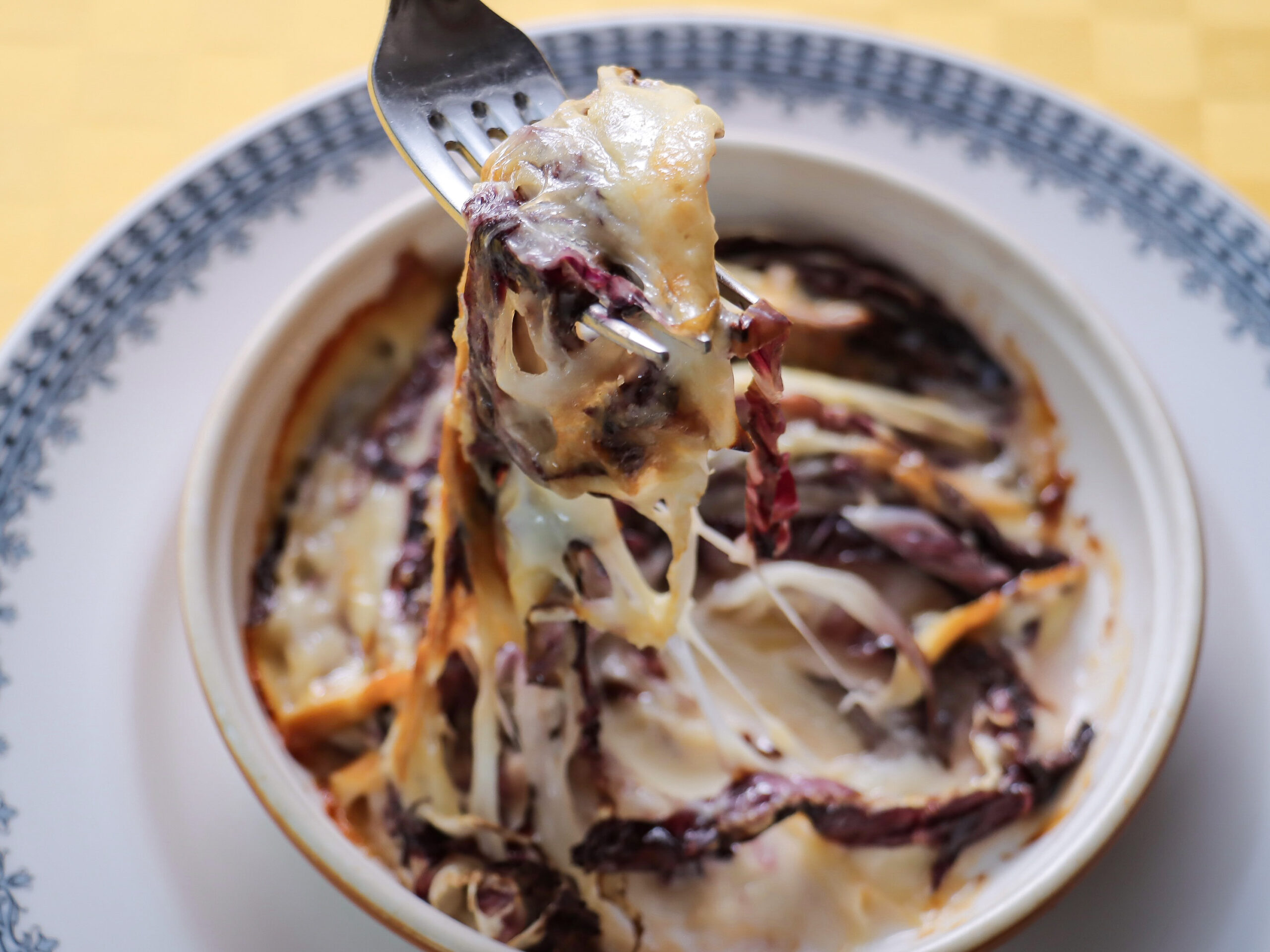 加熱すると美味しくなる燻製チーズ、スカモルツァチーズにラディッキオを合わせ、無塩バターとパルミジャーノ・レッジャーノを振りかけてオーブンで焼いた温前菜です。