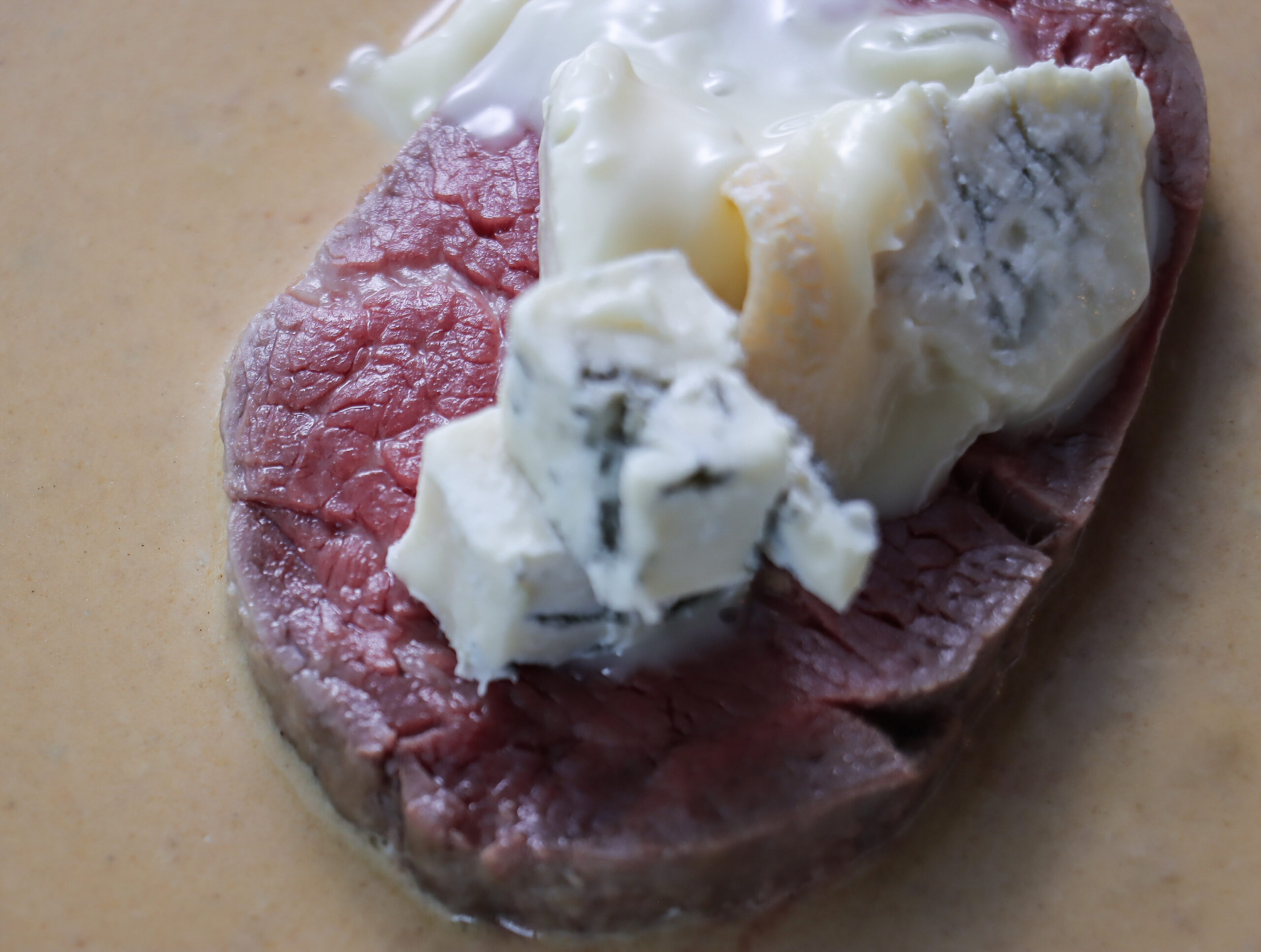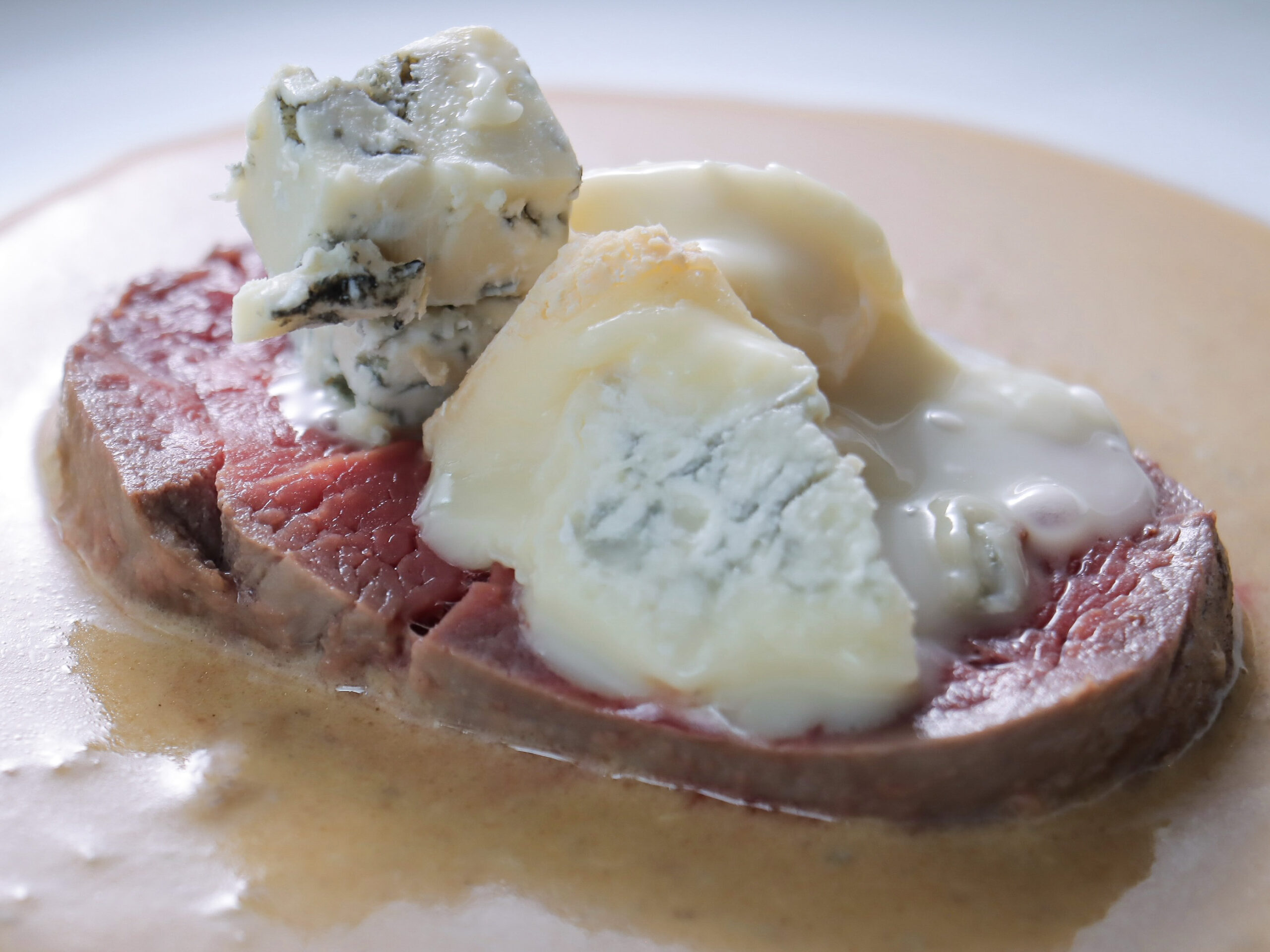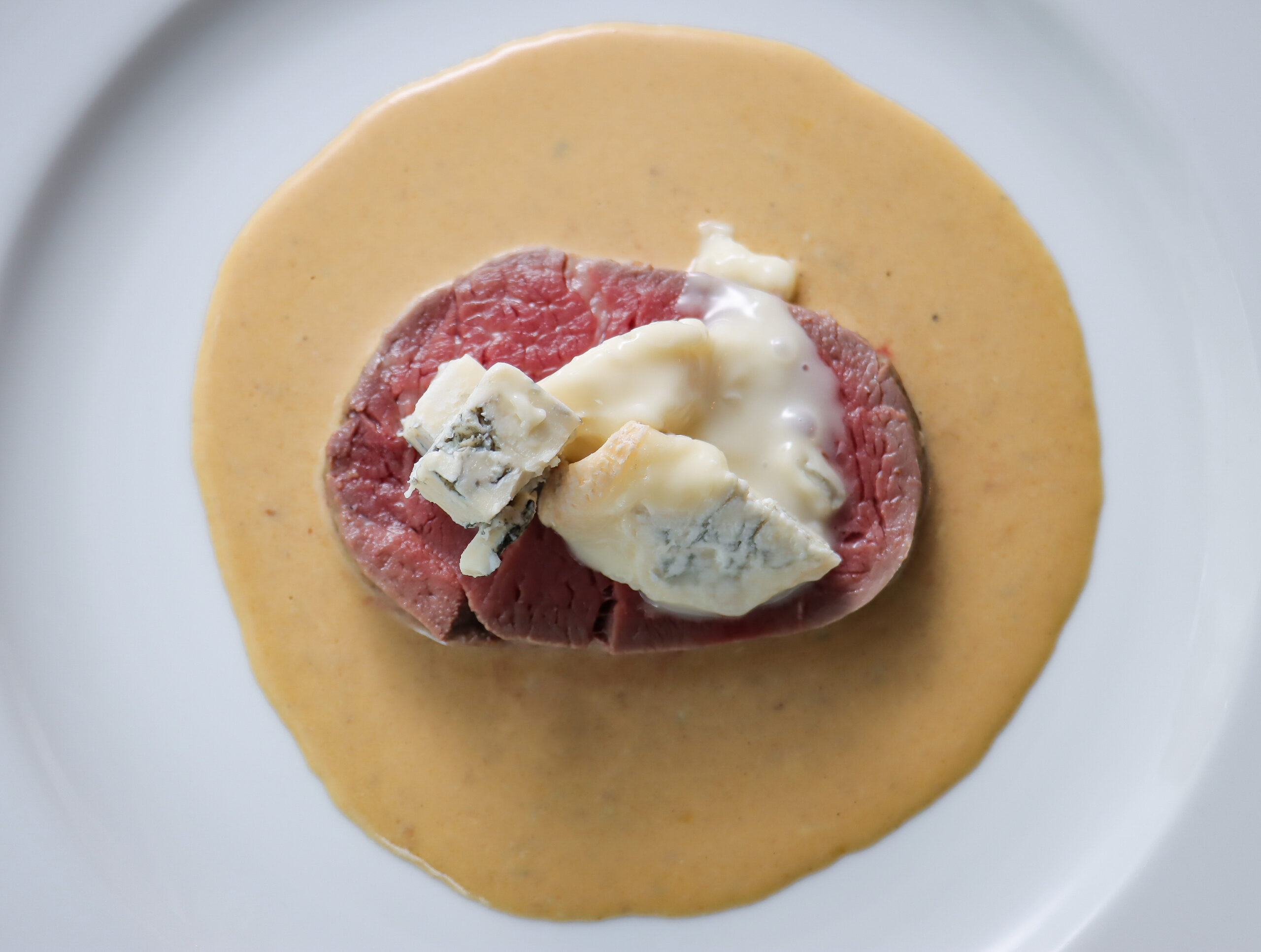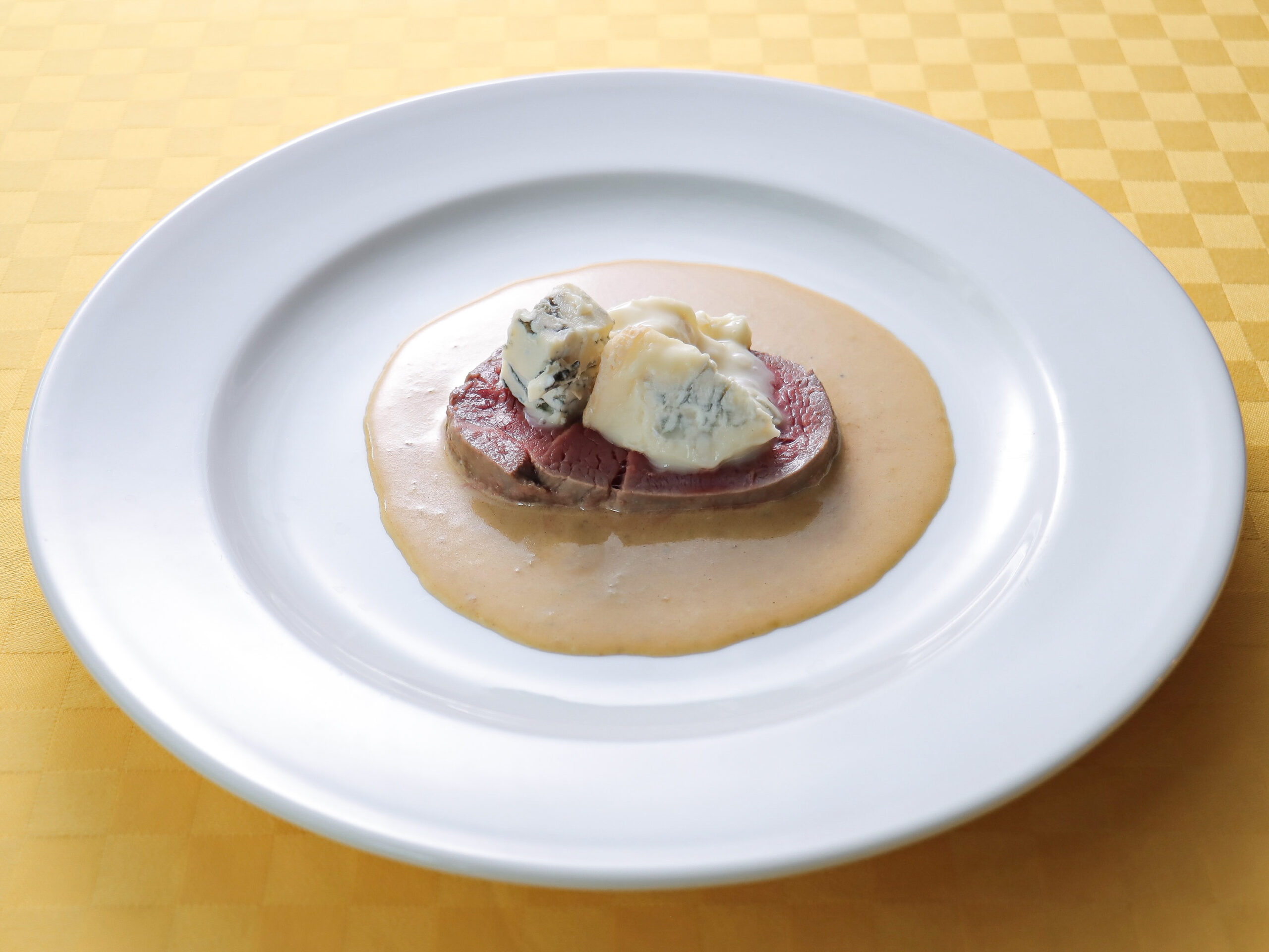 牛肉は、牛乳の加工品と相性抜群です。旨みが濃い牛フィレ肉に、味わい濃厚なゴルゴンゾーラチーズ2種からつくるソースを合わせました。